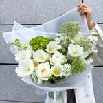 A refined bouquet of white tulips and roses, complemented by fresh green hydrangea and delicate seasonal textures. The soft white palette combined with vibrant green accents creates a clean, modern, and effortlessly elegant composition. Perfect for sophisticated gifting, celebrations, or minimalist interiors, this bouquet brings a sense of calm beauty and natural balance. Wrapped in premium designer paper and finished with a signature ribbon.