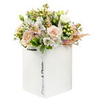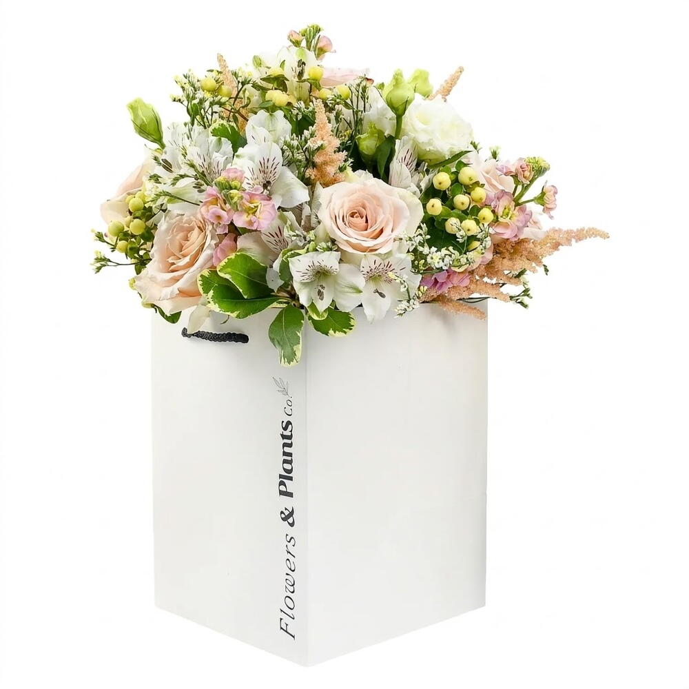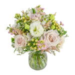 A wild and wonderful arrangement featuring our favourite roses, lisianthus, alstroemeria, hypericum fresh foliage.