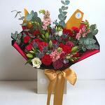 Introducing Wild Flame, a bouquet that burns with passion and elegance. A dramatic arrangement of deep red roses, vibrant carnations, romantic snapdragons, and textured thistles — all accented with fresh eucalyptus. Bold, soulful, and unapologetically striking, this bouquet is designed to make an unforgettable statement. Perfect for anniversaries, celebrations, or simply surprising someone special, Wild Flame is more than flowers — it’s emotion, art, and beauty combined. Wrapped in luxury cellophane, presented in a water-filled gift box, and finished with a gold satin bow for timeless sophistication. Care Instructions Keep the bouquet in its water-filled box or transfer to a vase with fresh, cool water. Trim stems at a 45° angle to encourage hydration. Change the water every 1–2 days and place in a cool location, away from direct heat or sunlight. With care, Wild Flame will stay radiant for 7 days or longer.