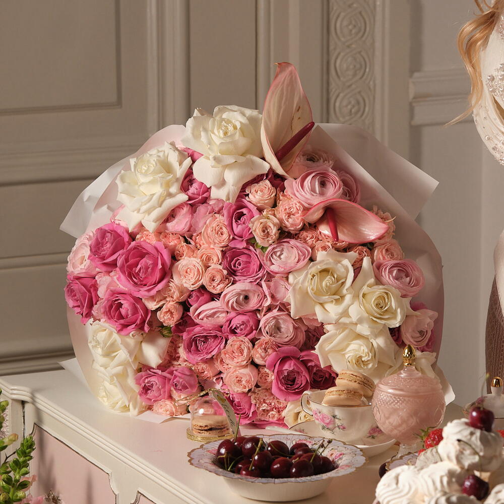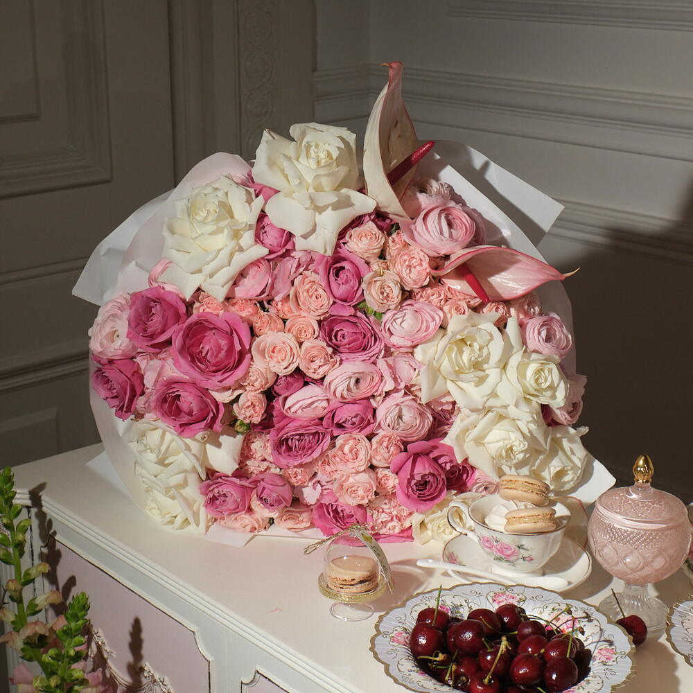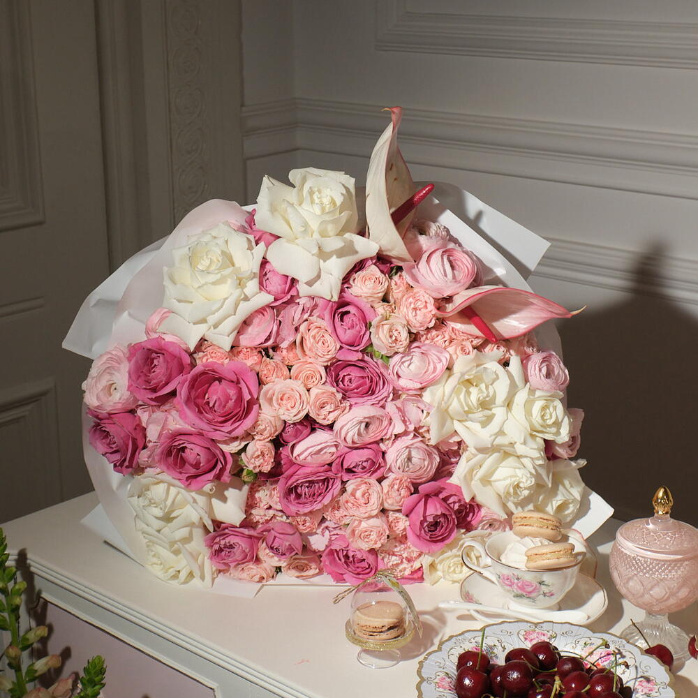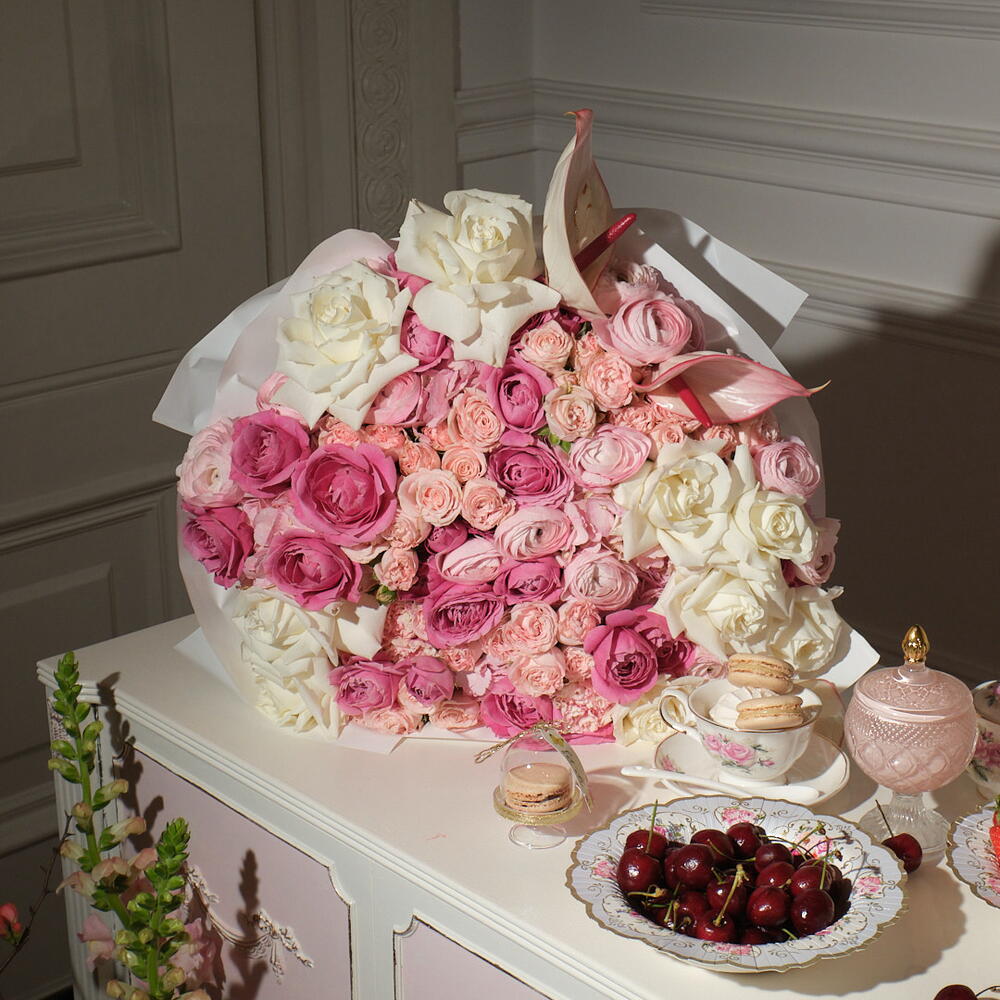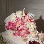 Anthurium - 2 pcs hydrangeas - 3 pcs ranunculus - 5 pcs spray roses - 5 pcs roses pink - 10 pcs light spray roses - 10 pcs