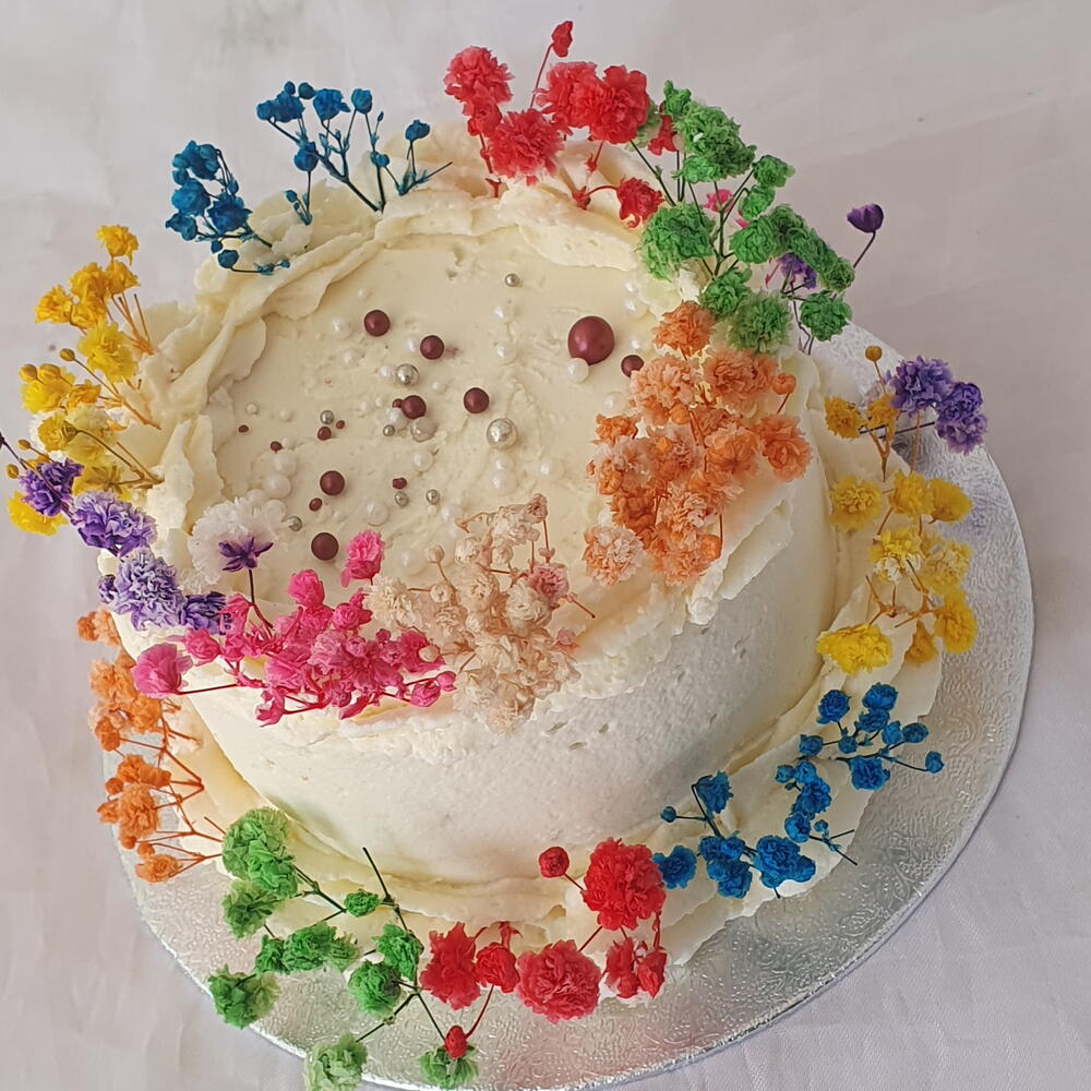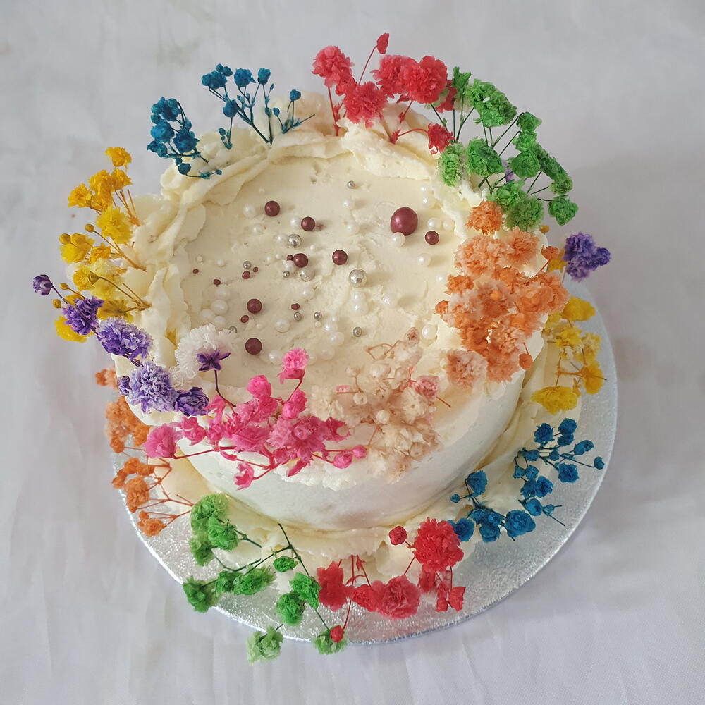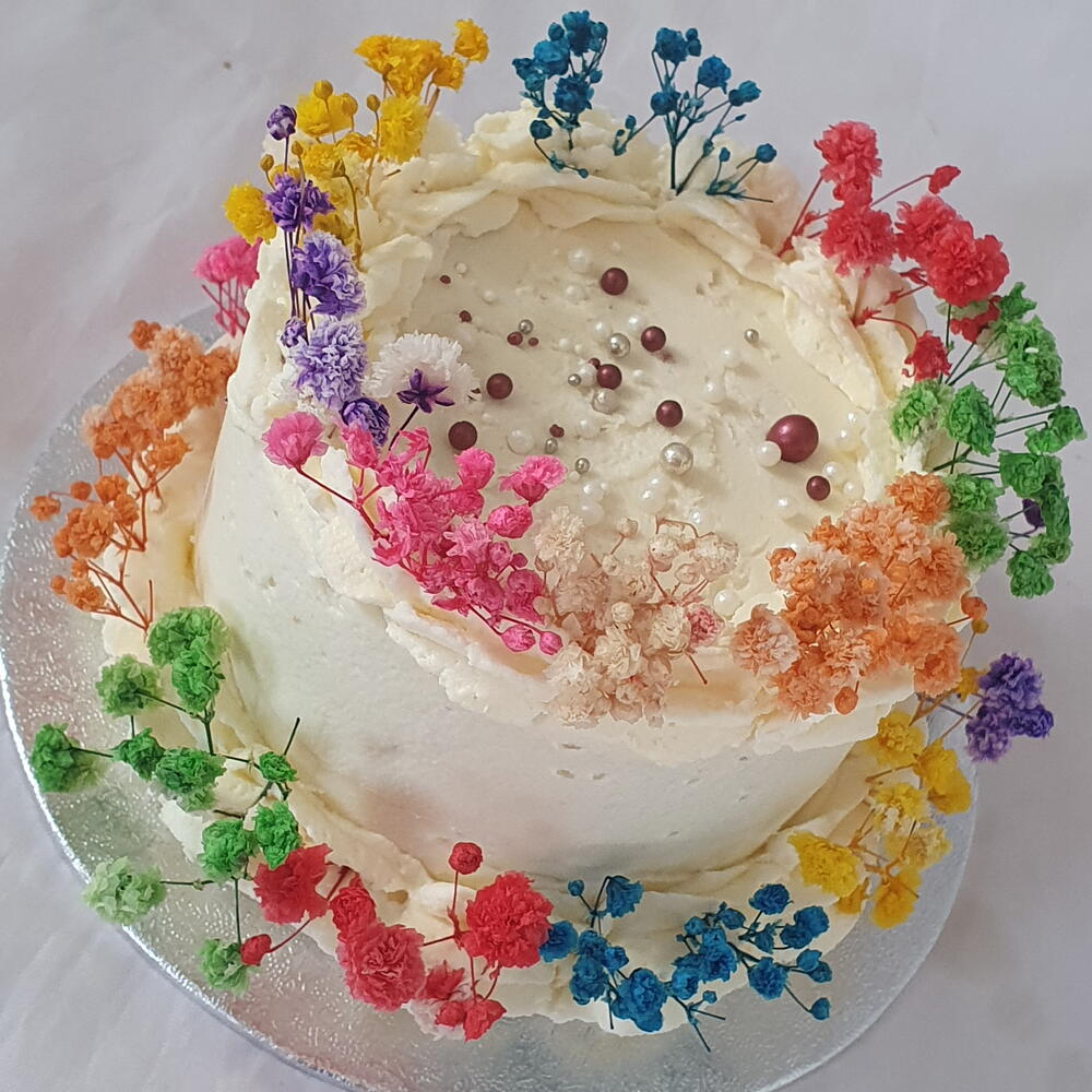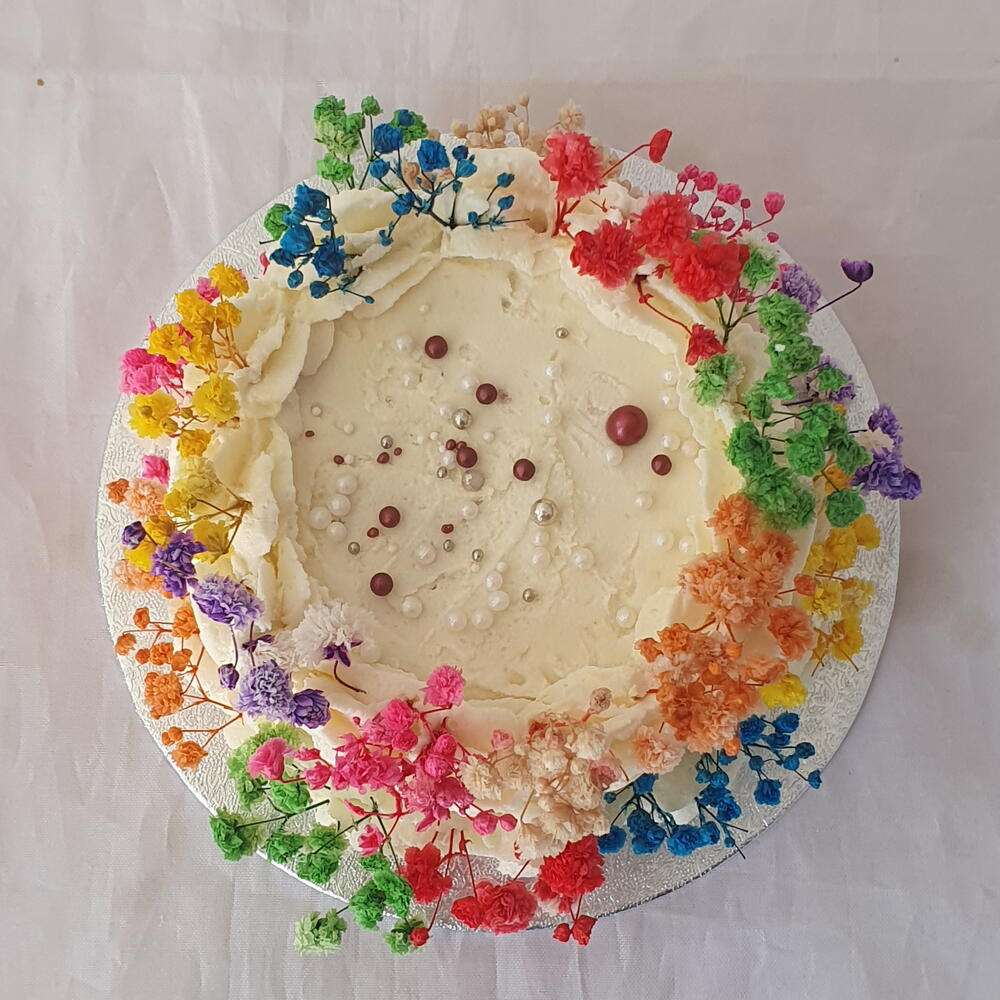 6 x 2 слоя ванильного бисквита Заполнен ванилью и джемом/ванильным масляным кремом и украшен разноцветной гипсофилой
