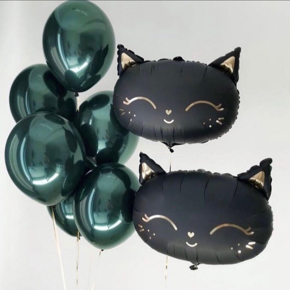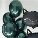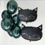 A stylish balloon arrangement featuring two big black cat foil balloons paired with glossy dark green latex balloons. Perfect for Halloween, themed parties, cat lovers’ birthdays, or as a fun and playful gift with a touch of mystery.