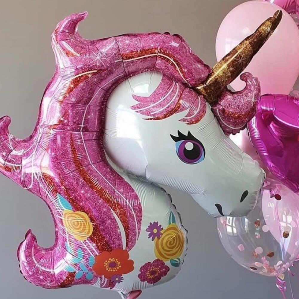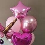 A magical balloon arrangement featuring a large pink unicorn foil balloon, paired with glossy balloons in pink shades, confetti balloons, a heart, and a star. Perfect for children’s birthdays, unicorn-themed parties, baby showers, or as a dreamy surprise for anyone who loves fairy-tale magic.