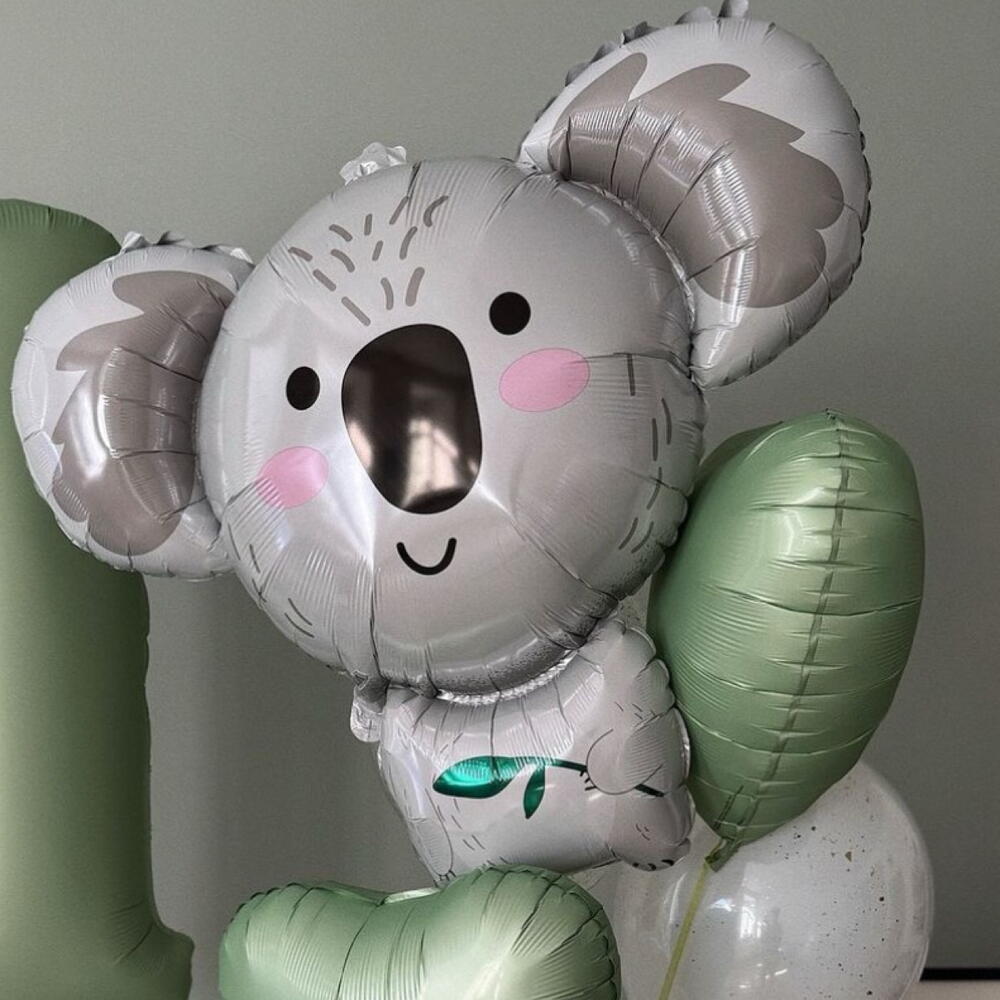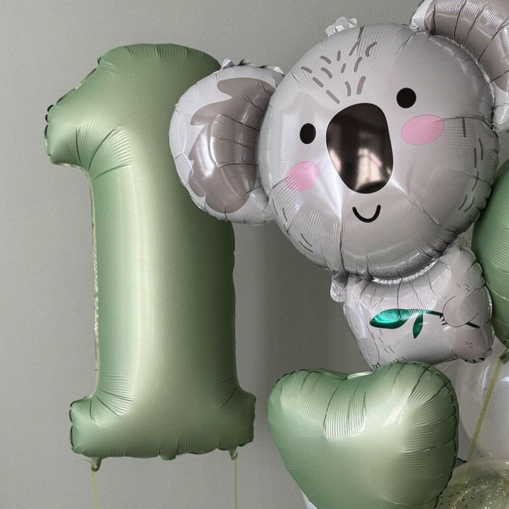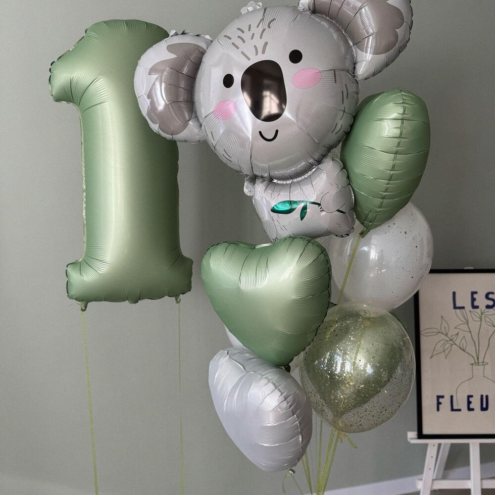 An adorable balloon arrangement featuring a big smiling koala foil balloon, a large number balloon, heart-shaped foils, and glossy balloons with confetti. Perfect for a child’s first birthday, baby shower, or as a cute and playful decoration for little ones’ celebrations. The number can be customised — just leave a comment with your order or send us a direct message to choose the digit you need.