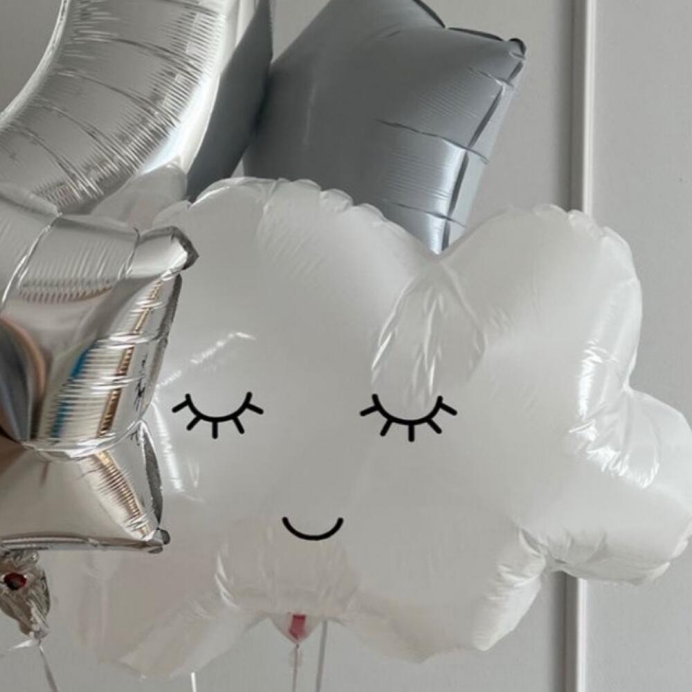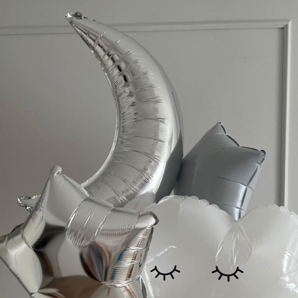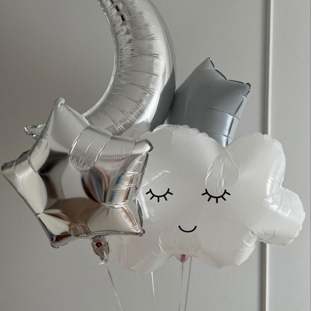 A dreamy balloon arrangement featuring a shiny silver moon, star-shaped balloons, and a cute smiling cloud. Perfect for baby showers, children’s birthdays, gender reveal parties, or as a magical decoration for night-sky or fairy-tale themed celebrations☁️