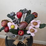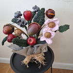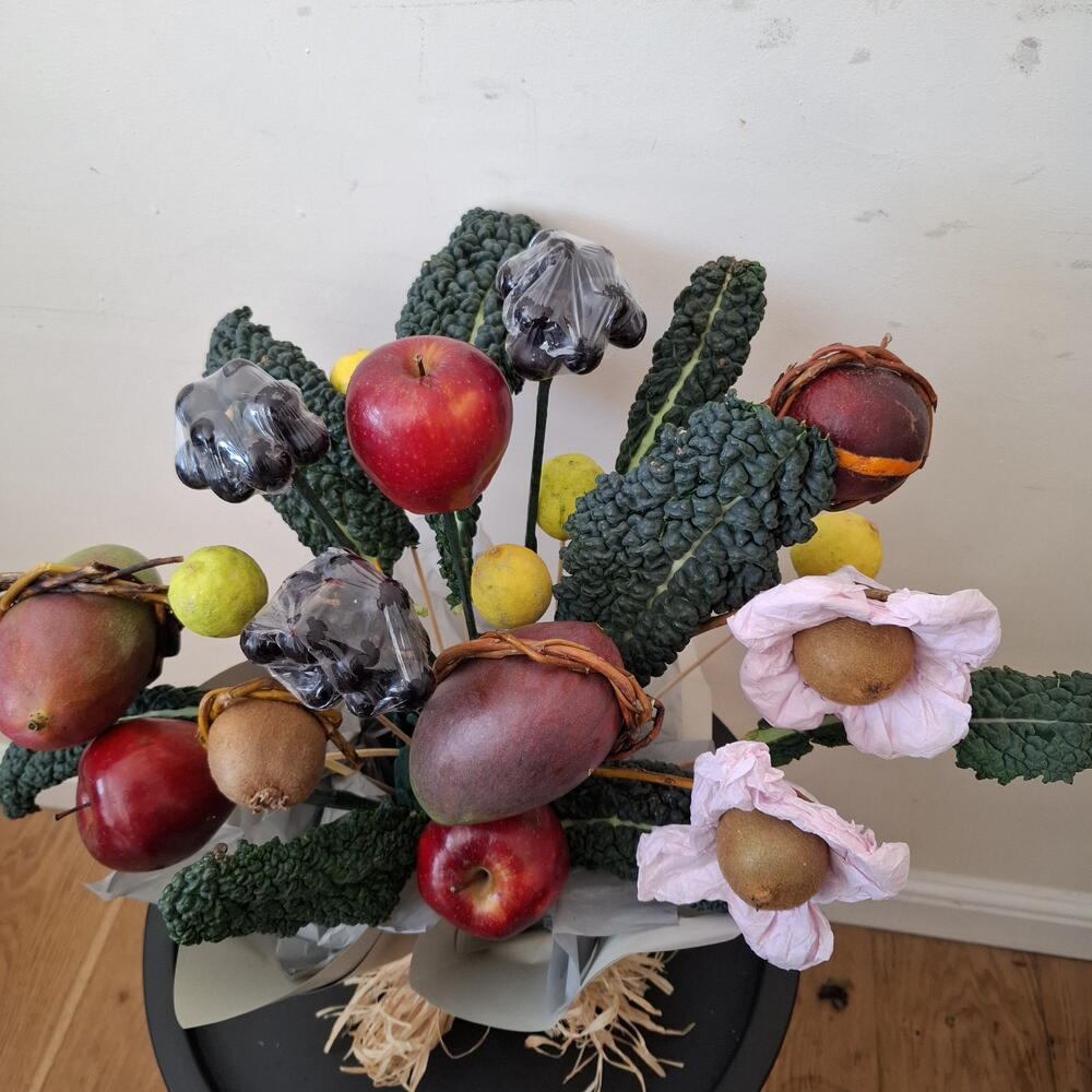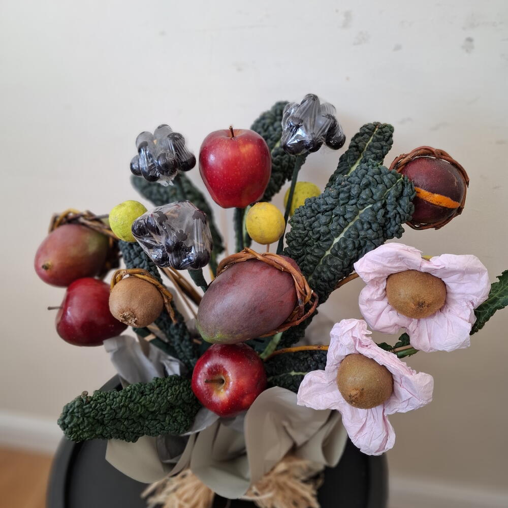 Потрясающее произведение искусства, которое можно съесть — ну, на самом деле фрукты и большую часть парящей зелени кейла. Фрукты в этом букете представлены целыми: некоторые аккуратно удерживаются на ивовой конструкции, другие крепятся шпажками. Виноград прикреплён порционно в целлофане, пригодном для компоста. Этот букет не только выглядит потрясающе — особенно благодаря добавлению цветов ручной работы из креповой/тишью бумаги — но и долго сохраняется, поскольку фрукты в этих частях можно заменить после того, как их съели, чтобы дольше любоваться букетом. Если вы действительно хотите отправить уникальный подарок для кого-то особенного, это идеальное фруктовое угощение, которое принесёт радость и улыбку.