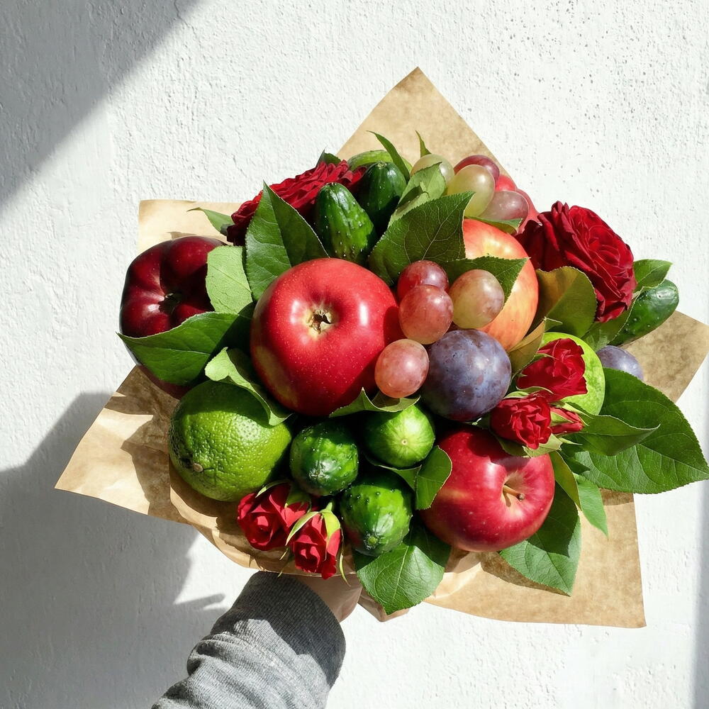 Роскошный букет свежих фруктов с красными розами — это уникальная и эффектная съедобная композиция, которая сочетает красоту глубоких красных роз со свежестью премиальных сезонных фруктов. Тщательно выполненный вручную, этот букет объединяет яркие яблоки, виноград, цитрусовые и свежие зелёные акценты с элегантными розами и натуральной зеленью, создавая подарок, который одновременно впечатляет внешне и восхищает вкусом. Идеально подходит для дней рождения, поздравлений, романтических жестов, корпоративных подарков или подарков в знак благодарности — этот гурманский фруктовый букет является незабываемой альтернативой традиционным цветам.