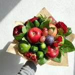 Роскошный букет из свежих фруктов и красных роз — изысканная съедобная цветочная композиция