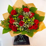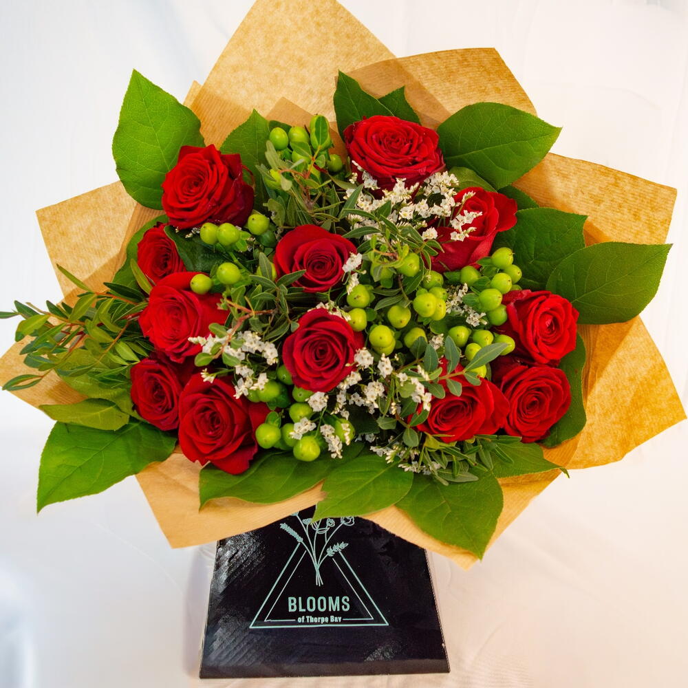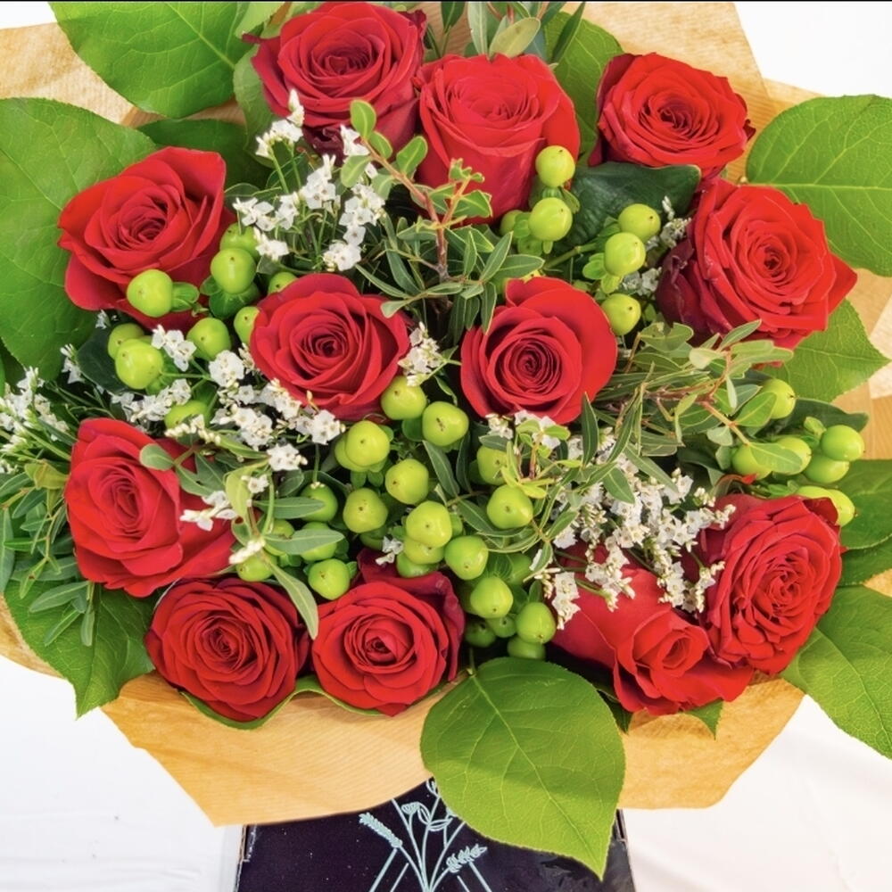 Классический и элегантный букет из двенадцати красных роз, дополненный белым лимониумом, яркими ягодами гиперикума и пышной сезонной зеленью. Идеально подходит для выражения любви, признательности или празднования — с вечной красотой и свежим, современным акцентом.