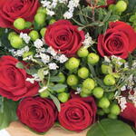 Red rose - 12 шт. hypericum - 6 шт. белый лимониум - 2 шт.