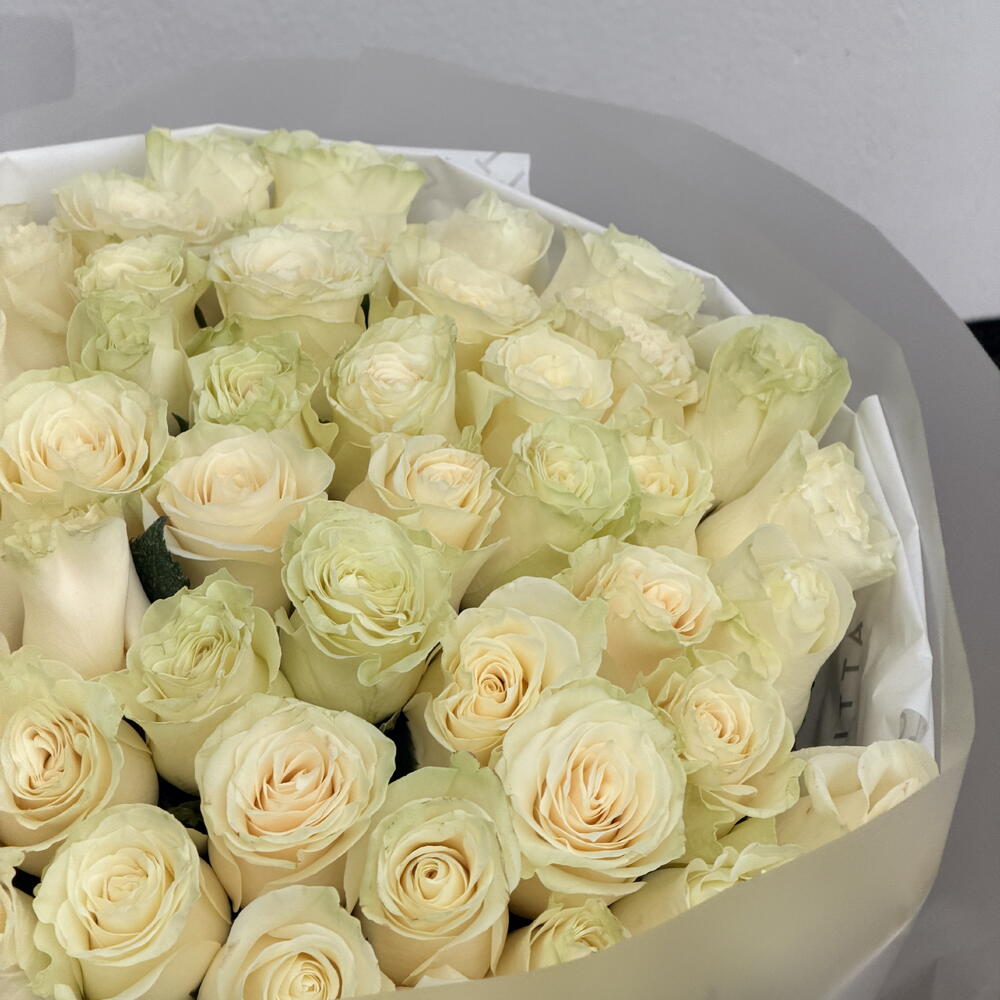A luxurious bouquet of 50 creamy roses, beautifully arranged in premium wrapping. Soft neutral tones create an elegant and timeless look. Perfect for expressing love, appreciation or simply brightening someone’s day with a touch of refined beauty 🤍✨