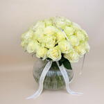 Ribbon - 1 шт. White rose - 50 шт. Vase - 1 шт.