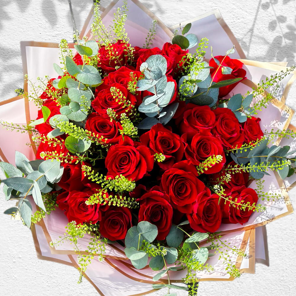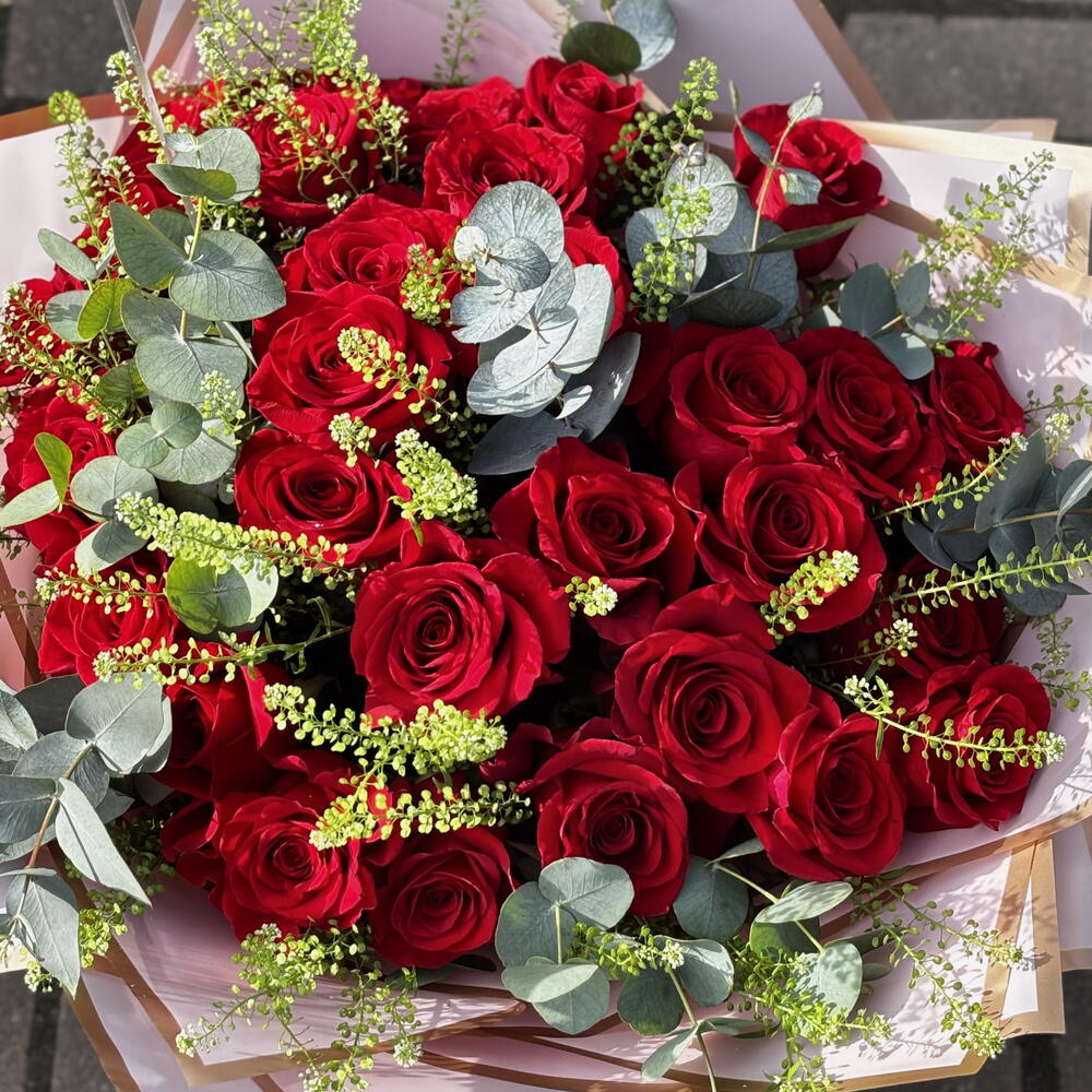 Green bell - 5 шт. eucalyptus leaves - 10 шт. премиальная красная роза - 51 шт.