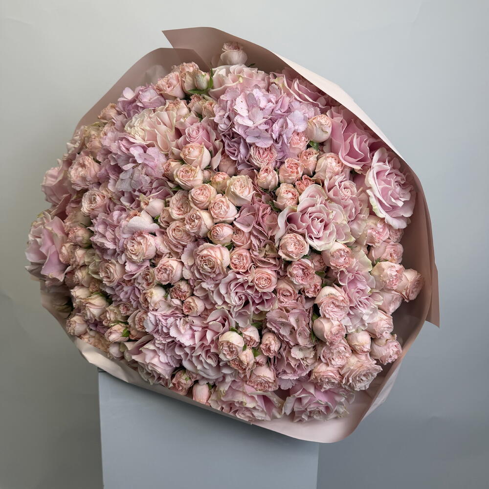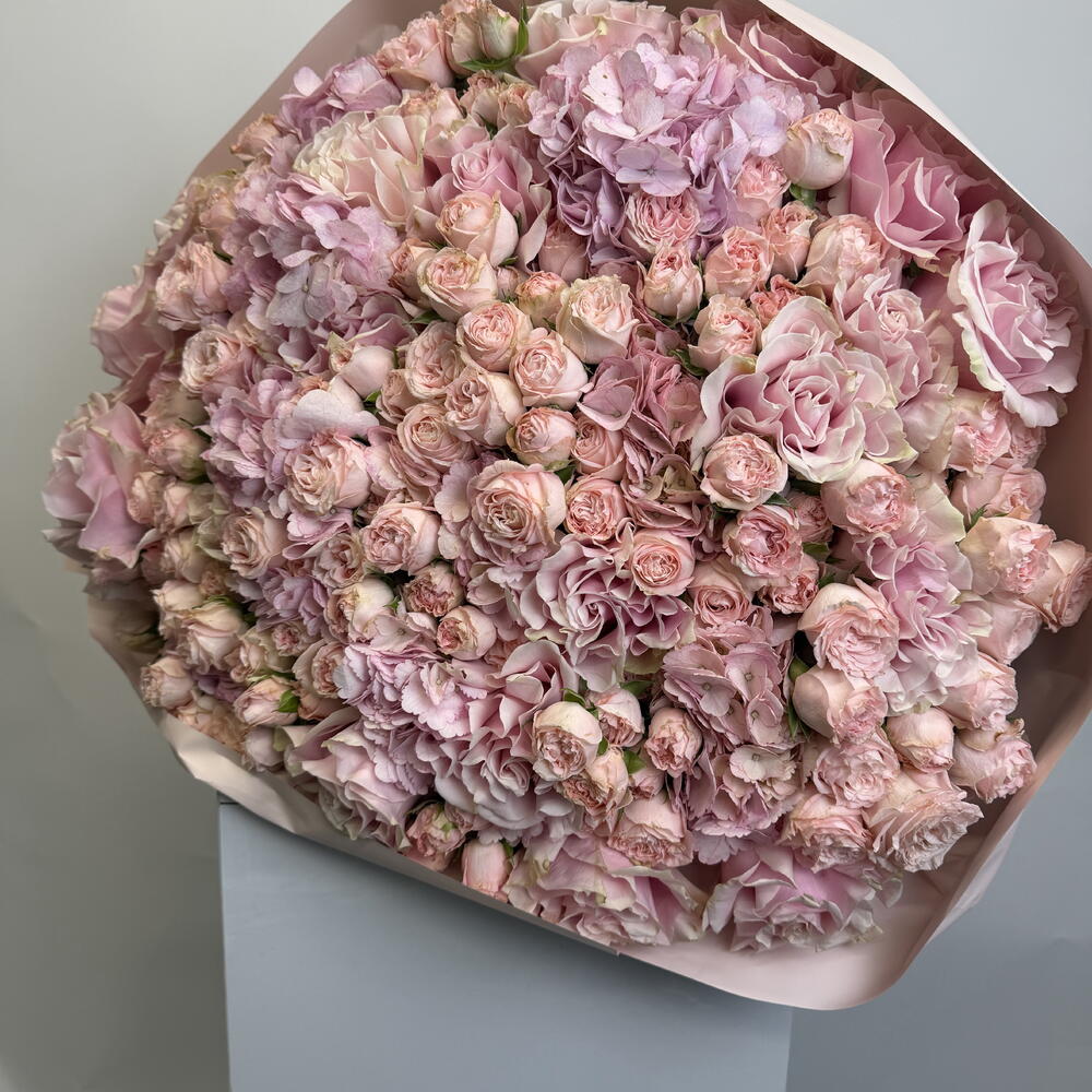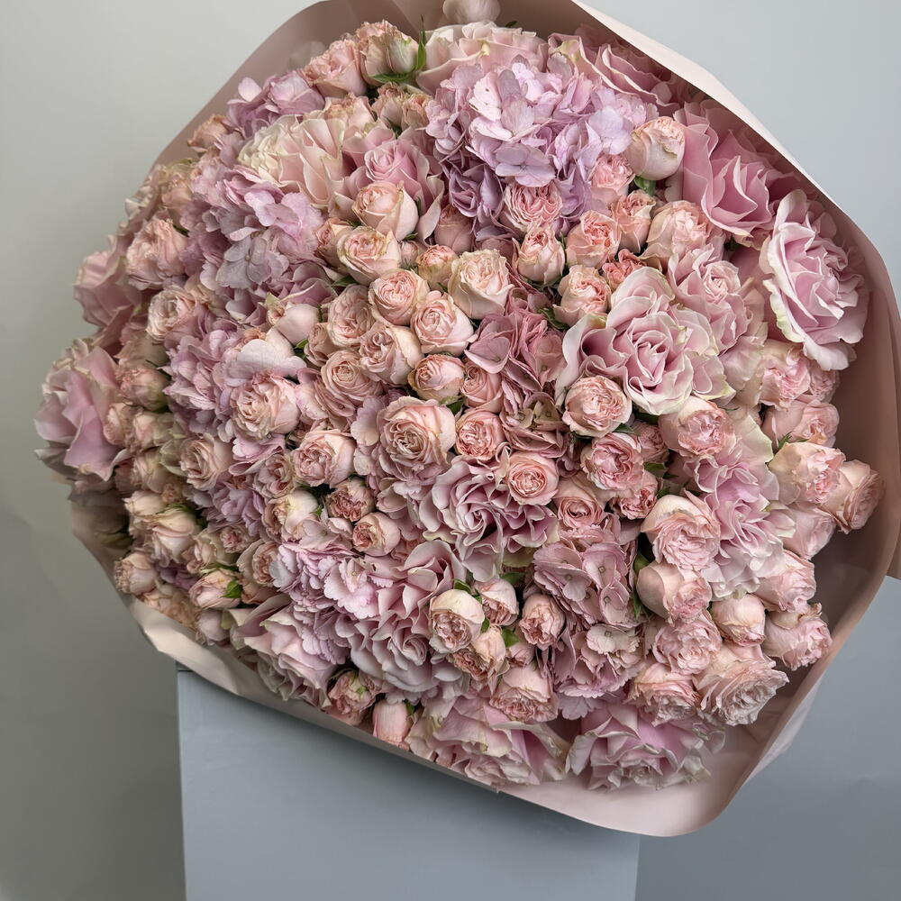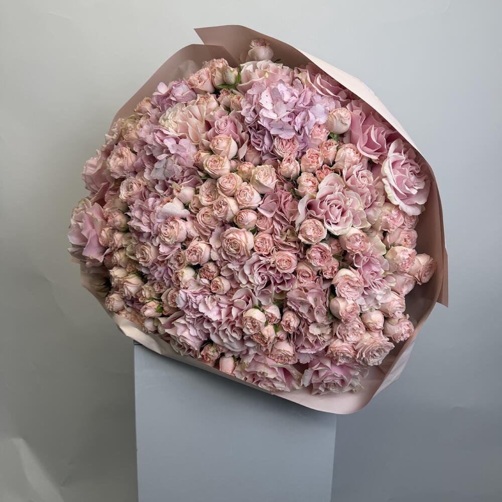 hydrangea pink - 7 шт. букет роз в брызгах - 30 шт. розовые розы - 15 шт.
