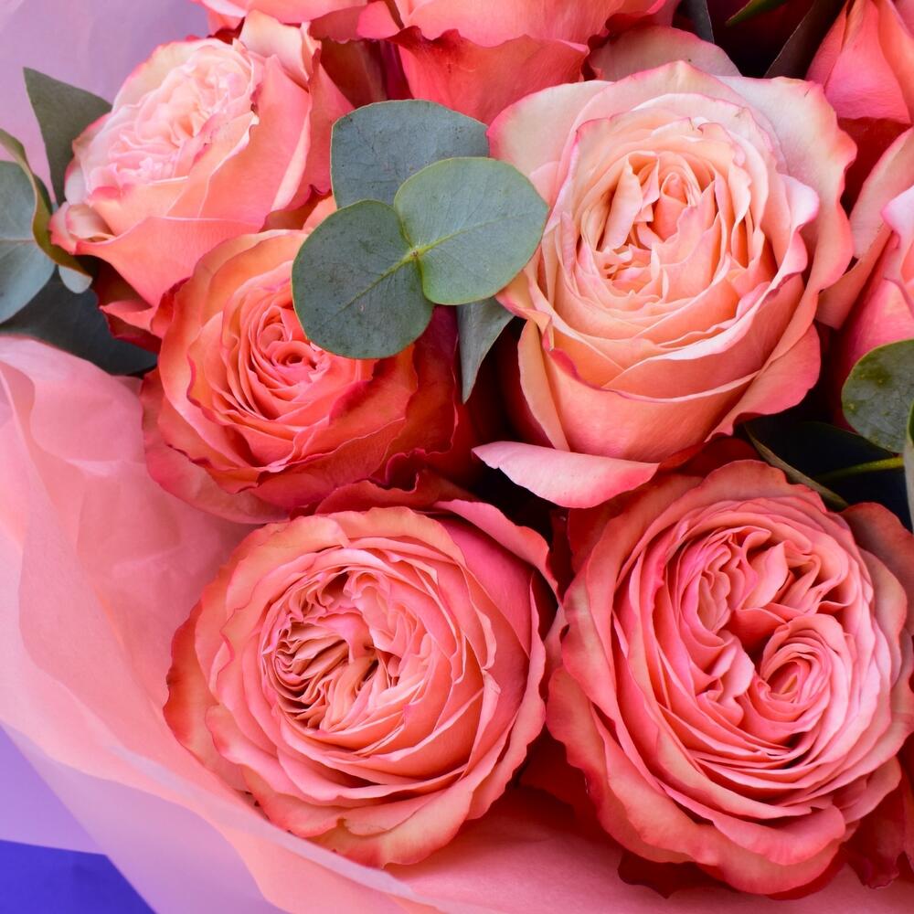 The "Apricot Sorbet" bouquet is a stunning arrangement of beautiful garden-like Kahala roses and fresh eucalyptus leaves. The bouquet features soft and delicate shades of peach, reminiscent of a sweet apricot sorbet on a warm summer day. The refreshing scent of the eucalyptus leaves adds a cooling touch to the warm tones of the bouquet, making it a perfect gift for any occasion. *Substitution Policy: Due to seasonal availability of certain flowers from time to time, we may use a substitution.