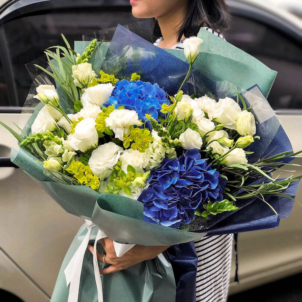 Eucalyptus - 10 шт. white lisianthus - 10 шт. alchemilla - 10 шт. белый бульон - 10 шт. голубые гортензии - 5 шт.