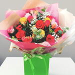 Этот букет из ярких смешанных роз в оттенках красного, розового, желтого и оранжевого принесет всплеск цвета и радости на любое мероприятие. Тщательно уложенный с нежной зеленью и украшенный гипсофилой, этот потрясающий букет станет идеальным подарком для любимого человека или ярким дополнением к вашему интерьеру. Завернутый в элегантную розово-белую ткань, букет помещен в стильную зеленую подарочную коробку, делая презентацию такой же красивой, как и сами цветы. Чтобы продлить свежесть букета, держите его в прохладном помещении с рассеянным светом. Регулярно меняйте воду и обрезайте стебли каждые несколько дней. Убедитесь, что букет находится вдали от прямых солнечных лучей, тепла и сквозняков.