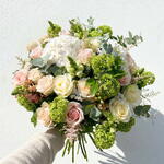 гортензия (белая) - 2 шт. спрей-розы (светло-розовые) - 5 шт. львиный зев (светло-зелёный) - 3 шт. астильба (нежно-розовая) - 4 шт. эвкалипт и сезонная зелень - 4 шт. гортензия калина (зелёная) - 3 шт. премиальные розы (бледно-розовые и кремовые) - 11 шт.