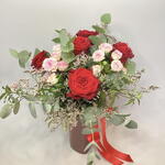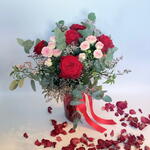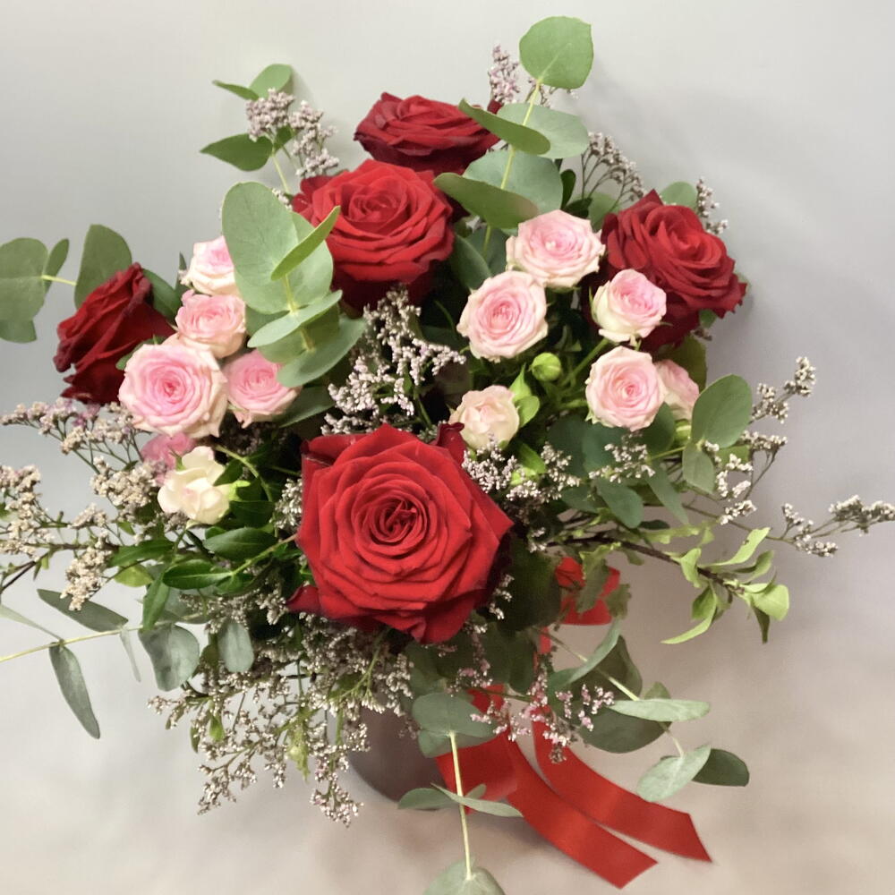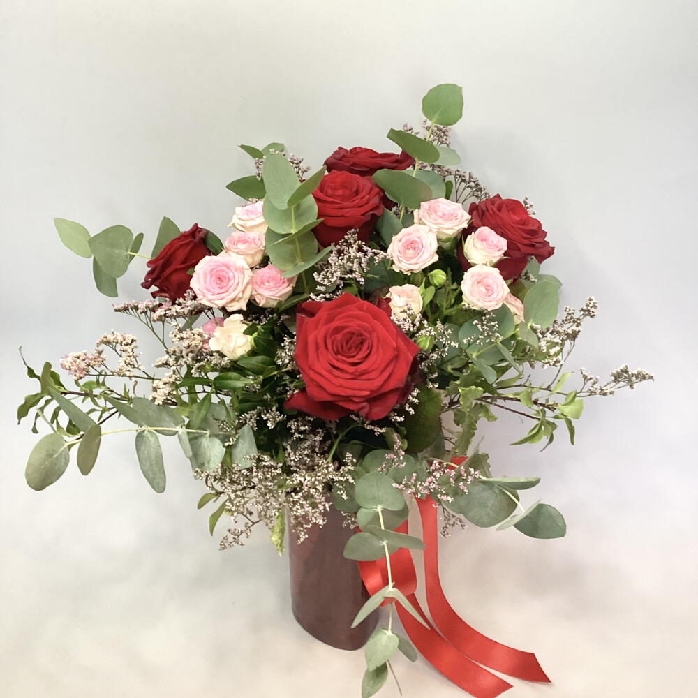 композиция в вазе из пяти красных роз, розовых спрей-роз, статицы и смеси зелени, оформленная красной атласной лентой.