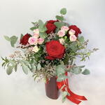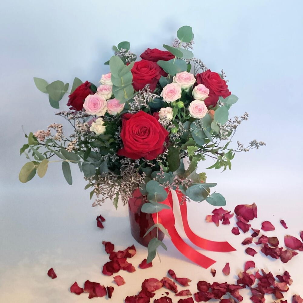 Eucalyptus - 5 шт. vase glass - 1 шт. pink spray rose - 2 шт. розовый лимониум - 2 шт. red roses - 5 шт.