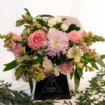 Pink rose - 1 шт. pink alstroemeria - 3 шт. white spray rose - 2 шт. pink carnation - 3 шт. chrysanthemum bloom - 1 шт. белая гермини - 1 шт. белый лимониум - 2 шт. розовый львиный зев - 3 шт.