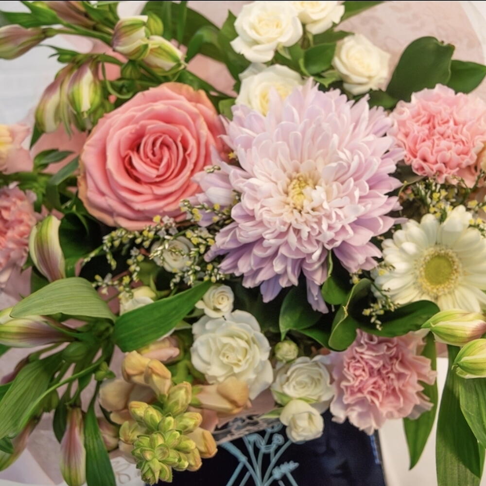 Pink rose - 1 шт. pink alstroemeria - 3 шт. white spray rose - 2 шт. pink carnation - 3 шт. chrysanthemum bloom - 1 шт. белая гермини - 1 шт. белый лимониум - 2 шт. розовый львиный зев - 3 шт.
