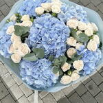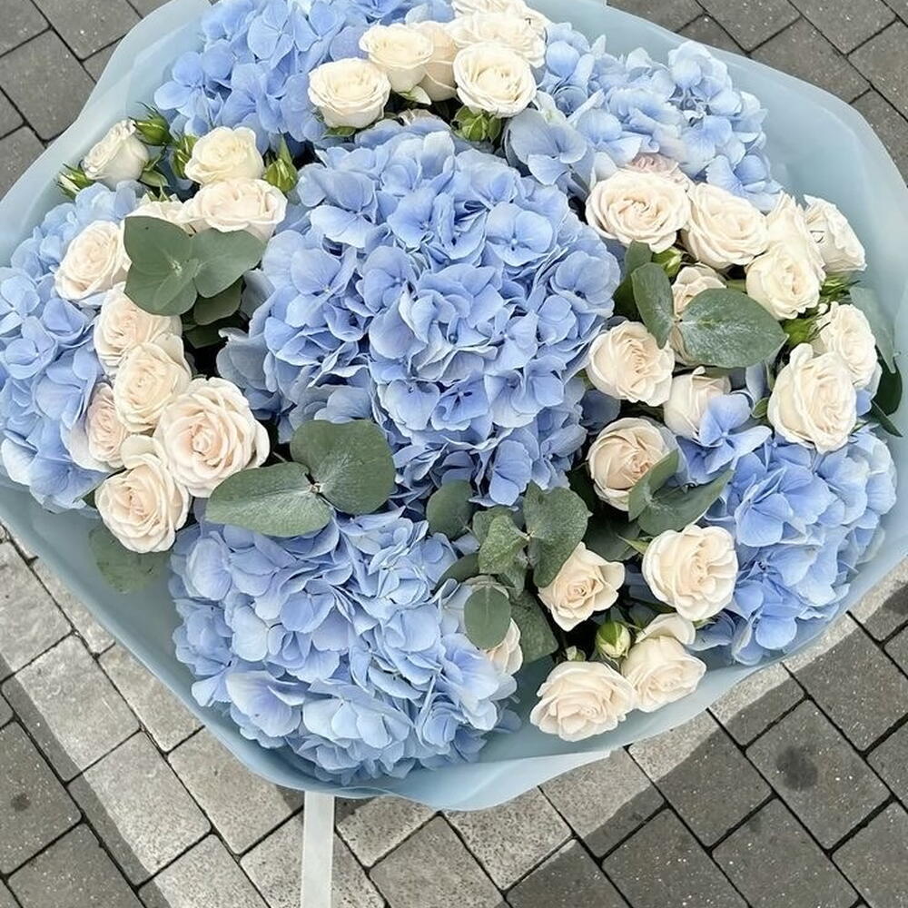 Этот монобукет — истинный триумф природы и эстетики! Пять веточек эвкалипта создают замечательный фон для переливающейся гортензии, которых в букете целых шесть. Не стоит забывать о десяти цветках спрей-роз — весёлом пятне, которое звучит как главная мелодия всего букета. Эта композиция идеальна для особых мероприятий или просто тёплых вечеров в кругу семьи.