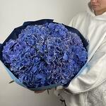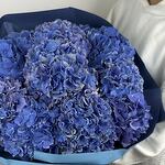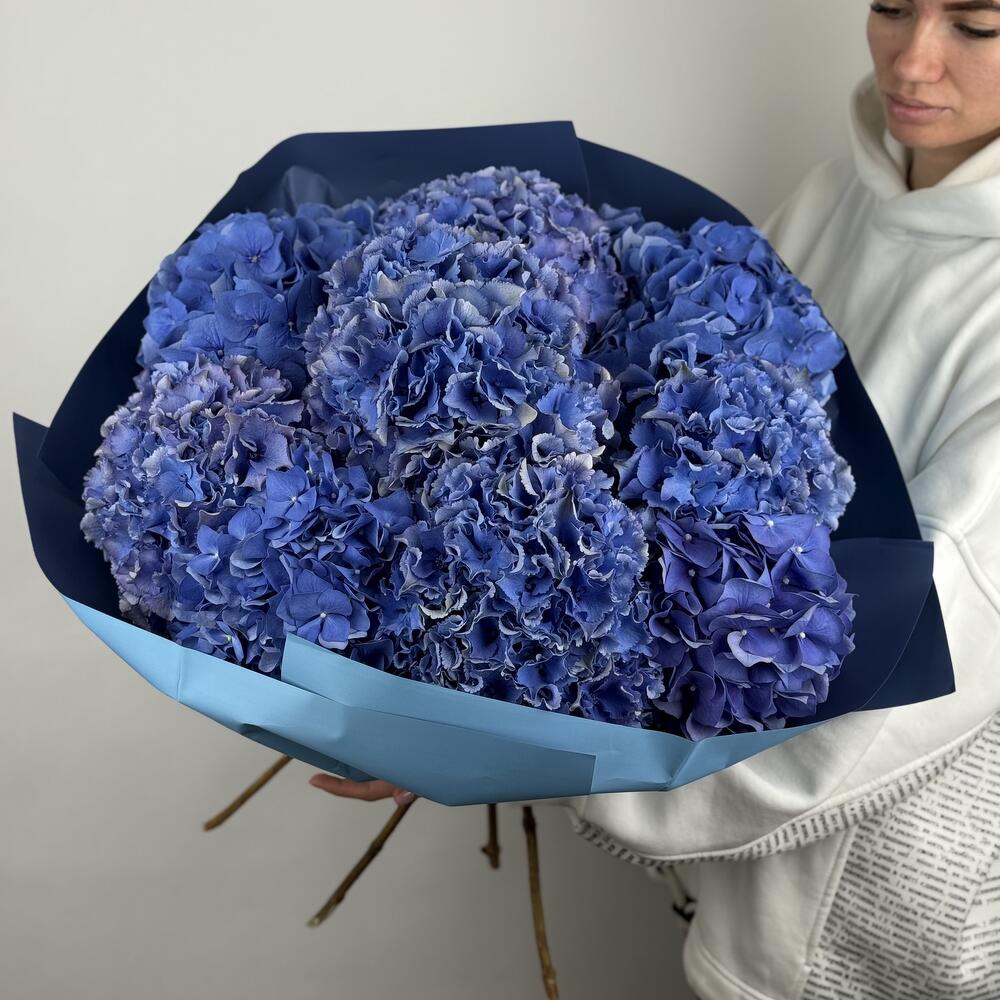 A luxurious bouquet of deep blue hydrangeas wrapped in matching tones — elegant, bold, and utterly captivating. The perfect statement piece for someone who appreciates timeless sophistication.