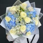 Окунитесь в успокаивающую красоту нашего букета Blue Serenity — великолепной композиции, сочетающей элегантность кремово-белых роз, нежное очарование белых альстромерий, свежую привлекательность эвкалипта и яркие синие тона гортензий. Этот букет — гармоничная симфония цветов и фактур, излучающая ощущение спокойствия и грации. Пышные белые розы символизируют чистоту и вечную красоту, тогда как синие гортензии добавляют нотку умиротворения и покоя. Белые альстромерии привносят оттенок утончённости, а листья эвкалипта завершают композицию свежим, ароматным акцентом. Искусно оформленный и упакованный в элегантную белую упаковку, это подарок, который говорит о элегантности и внимательности.