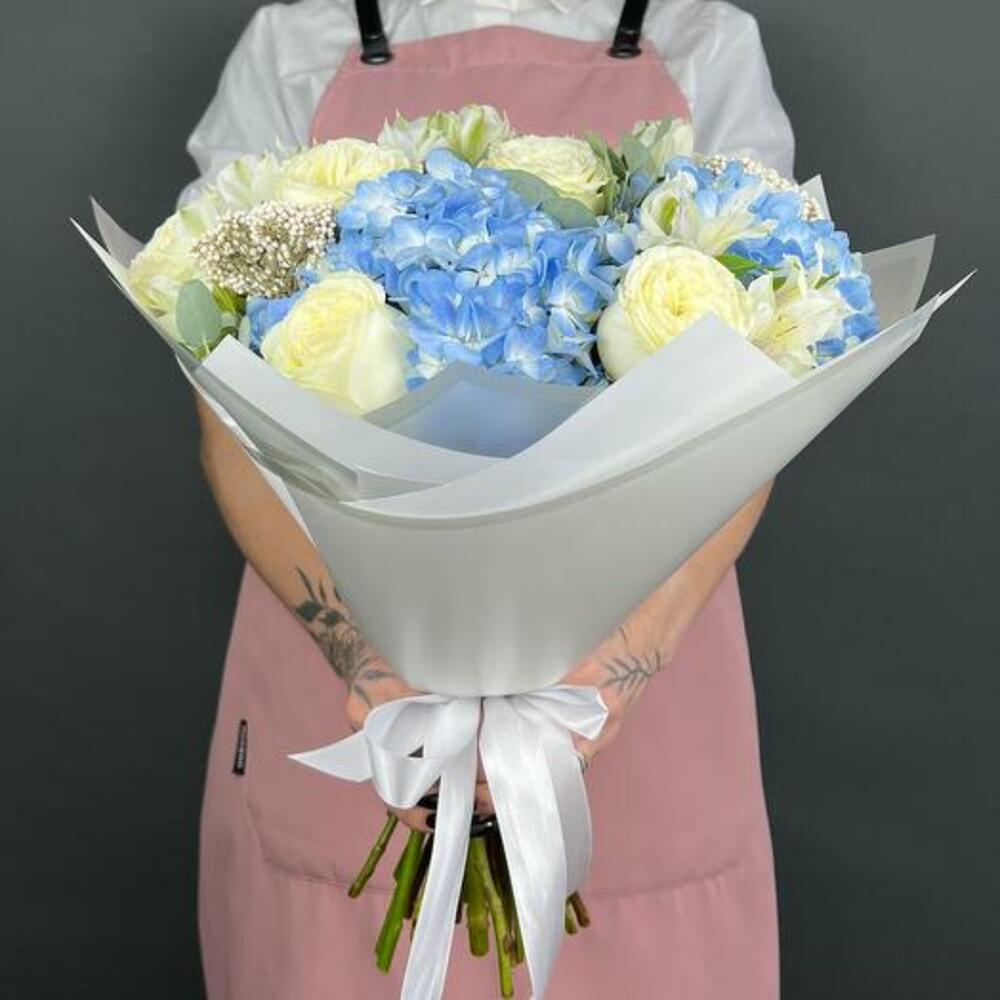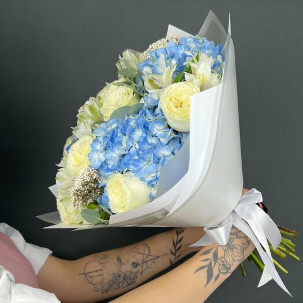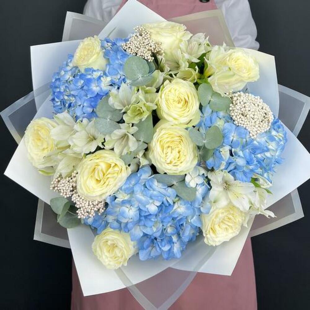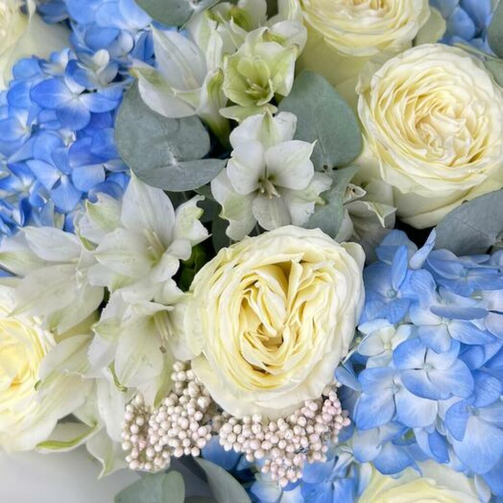 Окунитесь в успокаивающую красоту нашего букета Blue Serenity — великолепной композиции, сочетающей элегантность кремово-белых роз, нежное очарование белых альстромерий, свежую привлекательность эвкалипта и яркие синие тона гортензий. Этот букет — гармоничная симфония цветов и фактур, излучающая ощущение спокойствия и грации. Пышные белые розы символизируют чистоту и вечную красоту, тогда как синие гортензии добавляют нотку умиротворения и покоя. Белые альстромерии привносят оттенок утончённости, а листья эвкалипта завершают композицию свежим, ароматным акцентом. Искусно оформленный и упакованный в элегантную белую упаковку, это подарок, который говорит о элегантности и внимательности.