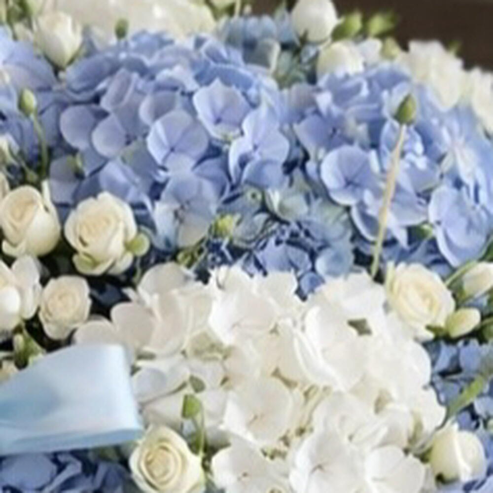Blue hydrangeas, white hydrangeas, and a spray roses—blending into one beautifully calming composition.