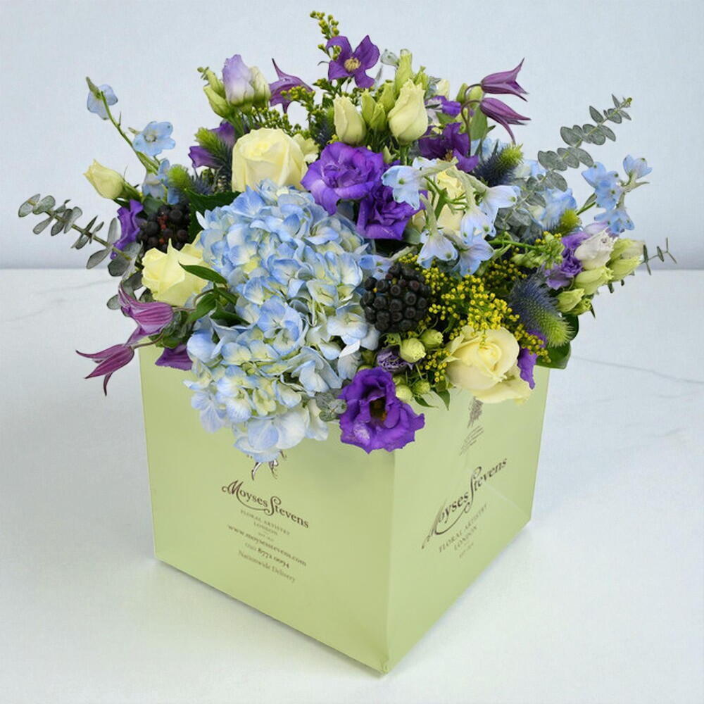 Мы считаем, что «Голубое небо» — один из наших лучших букетов на сегодняшний день. В этот лазурный вихрь гортензий, чертополоха, клематиса и лизиантуса наши флористы добавили эвкалипт и белые розы для потрясающего контраста и лёгкого древесного аромата. Попробуйте этот букет, который непременно нужно подарить по особому случаю или просто побаловать себя.