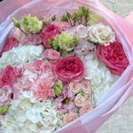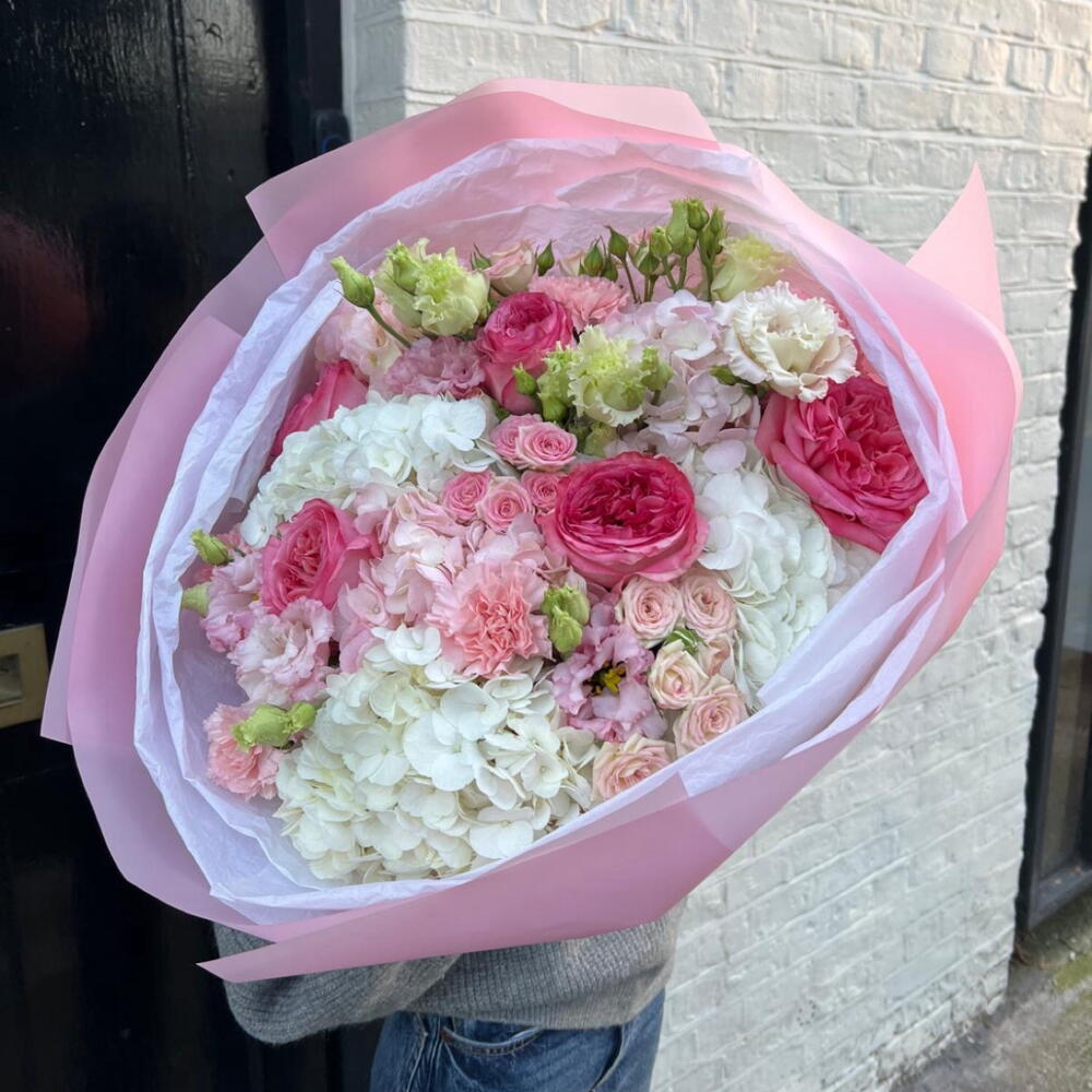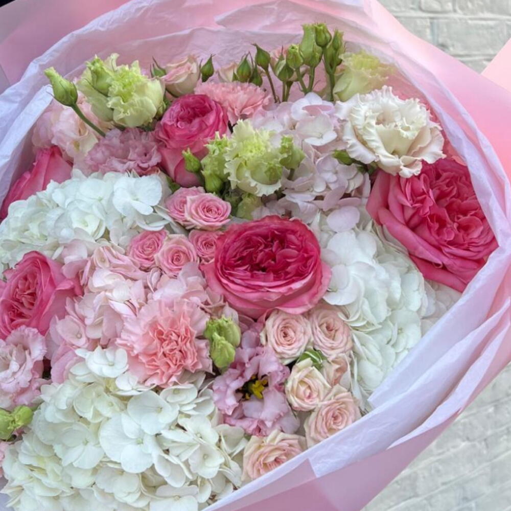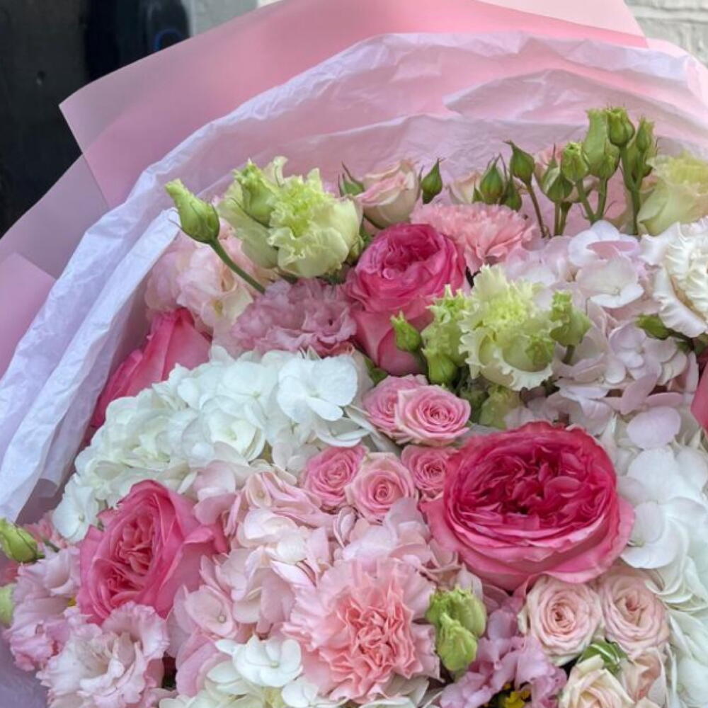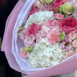 A delicate pastel bouquet with hydrangeas and roses, arranged in soft blush tones — elegant and perfect for any occasion.
