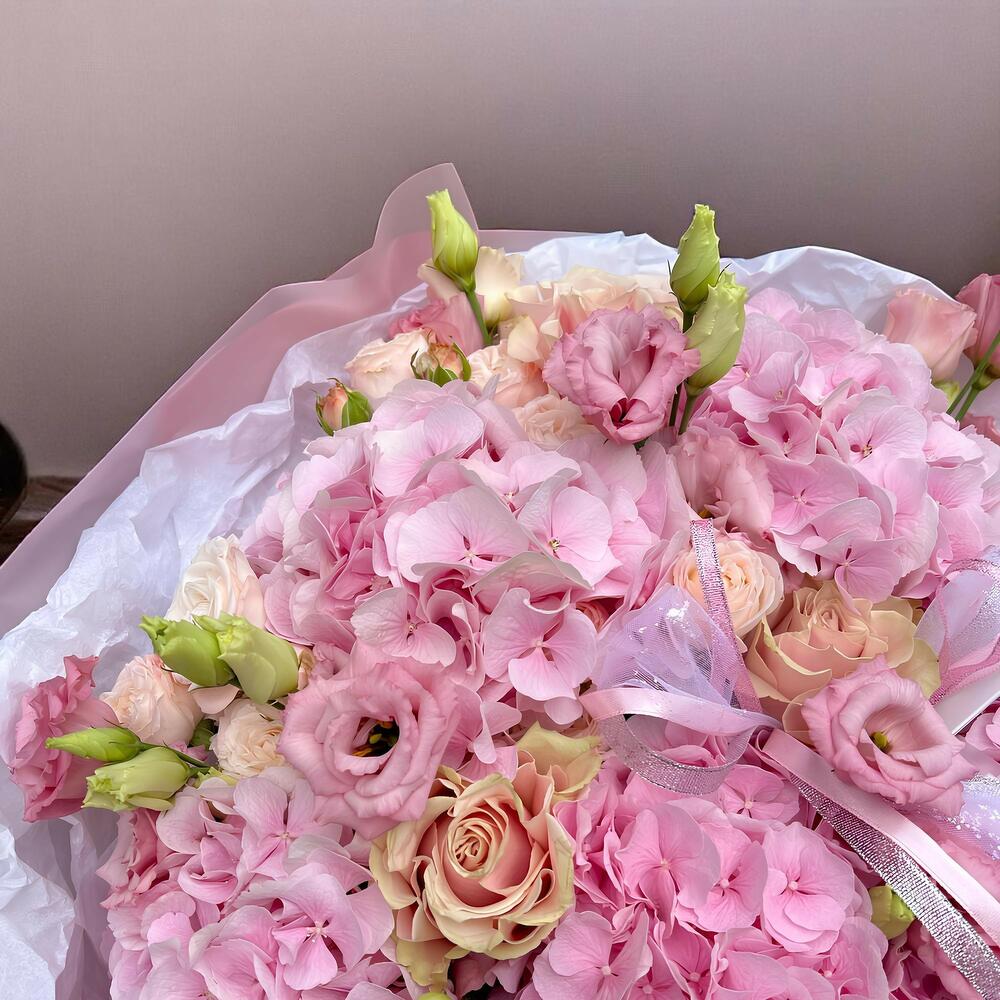 Eustoma - 7 шт. Hydrangea - 8 шт. ozothamnus - 3 шт. spray roses - 6 шт.