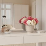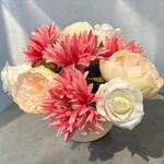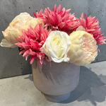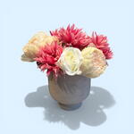 Композиция Blush Sorbet Bloom — очаровательный букет в нежно-розовой вазе из камня. Яркие герберы цвета сорбета, нежные пионы нежно-розового оттенка и элегантные бутоны роз цвета слоновой кости создают свежий и изысканный образ. Гармоничные тона привносят тепло, мягкость и современную цветочную красоту на полки, столы или в приемные.
