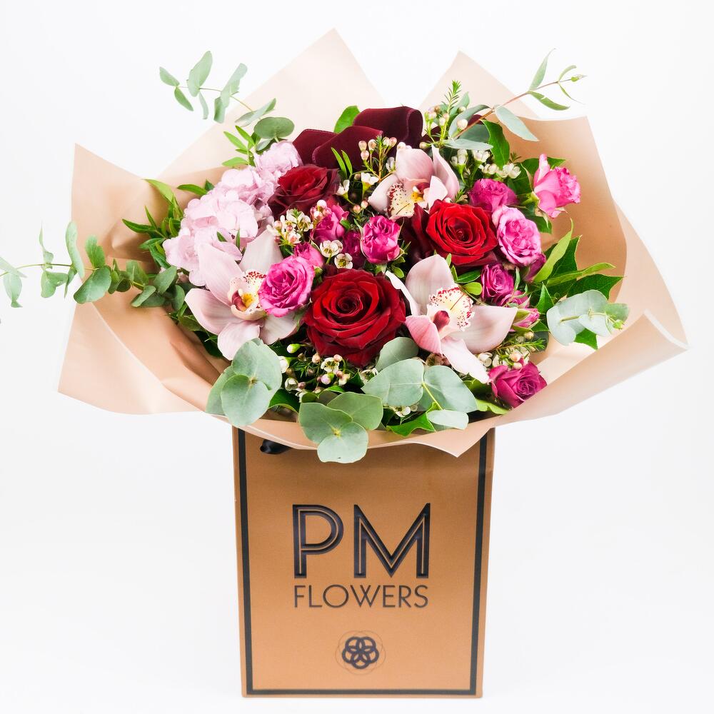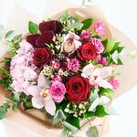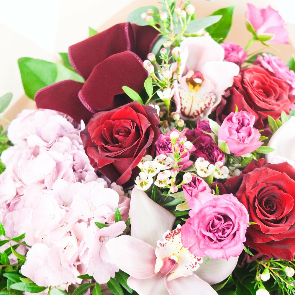 Букет из красных роз, мальвовой гортензии, белого ваксфлауэра, розовых орхидей и пурпурных спрей-роз. Дополнен соответствующей зеленью и красной бархатной лентой.