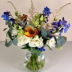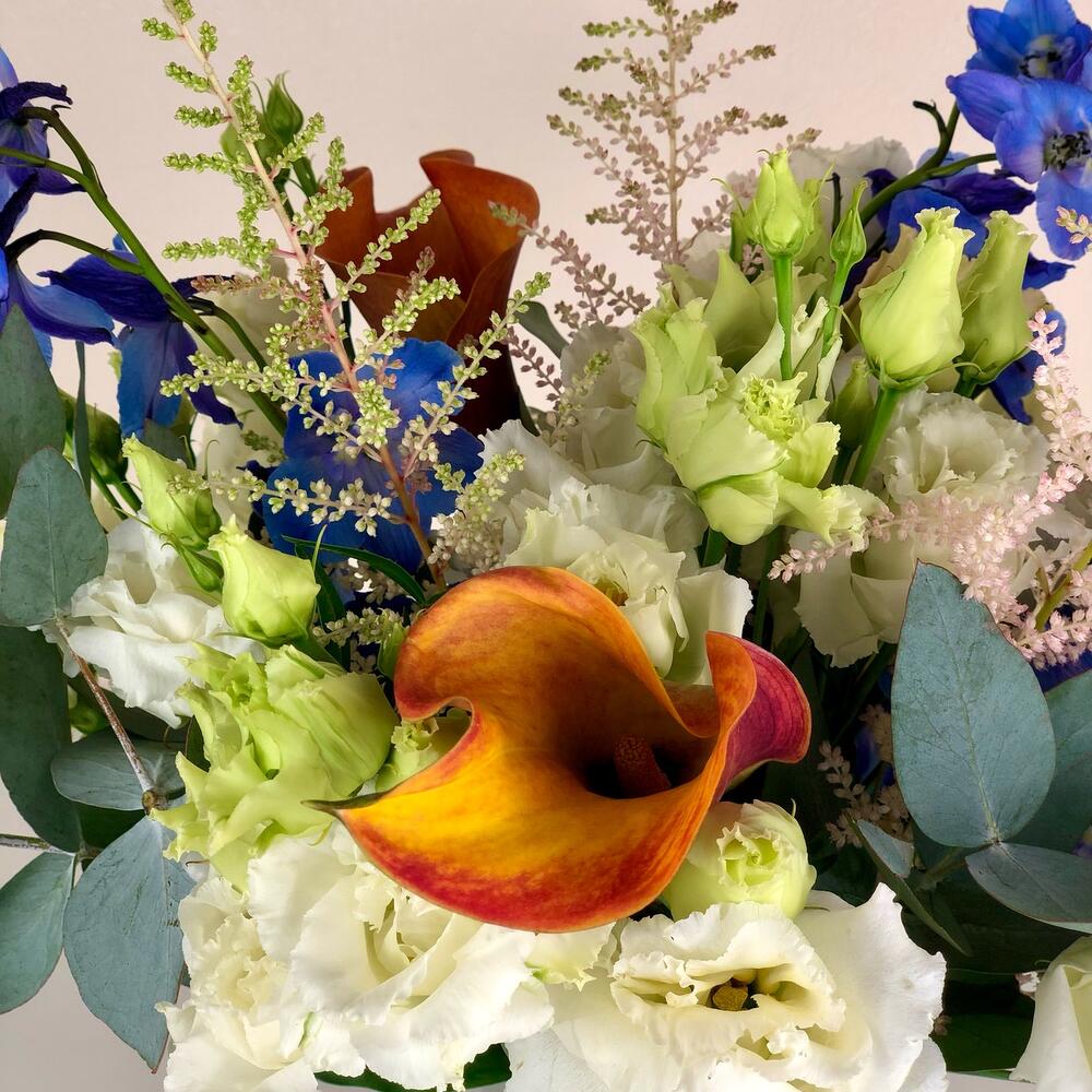 Эта цветочная композиция представляет собой смесь персиковой каллы, синего дельфиниума, белой лиси и эвкалипта. В комплект входит красивая ваза, перевязанная вручную.