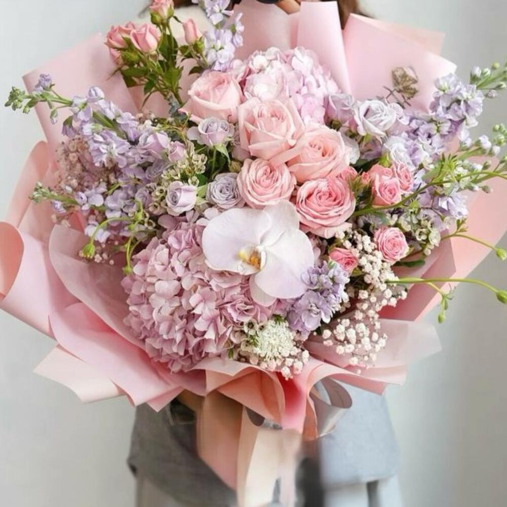 pink hydrangeas - 1 шт. фиолетовый запас - 5 шт. букет роз в брызгах - 3 шт. pink roses - 5 шт.