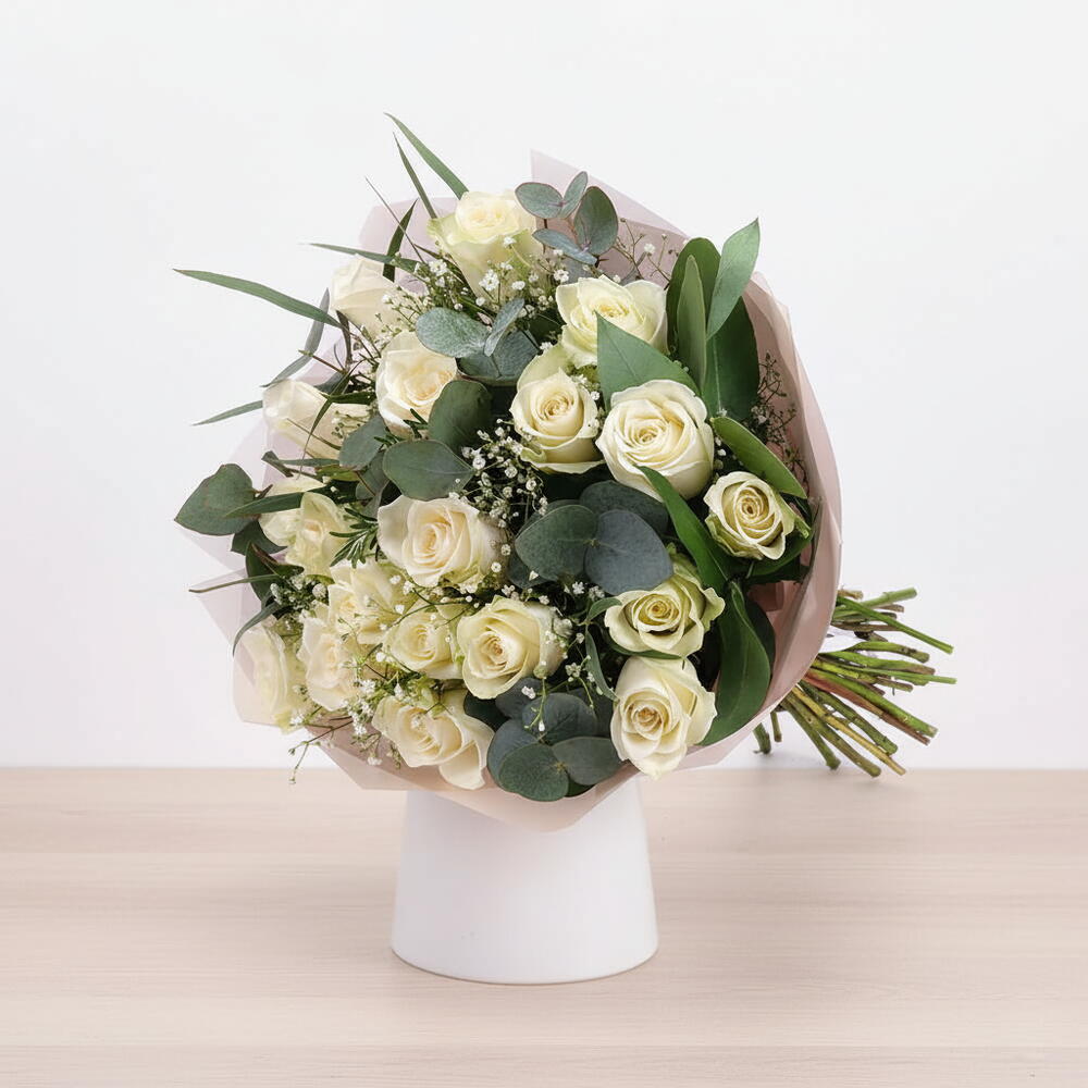 This elegant bouquet, composed of white roses—the symbol of purity and refinement—is one of the simplest yet most touching ways to express your feelings. Adorned with fresh white roses, eucalyptus leaves, and delicate gypsophila, this floral arrangement radiates luminous purity. Its pastel-toned wrapping adds a touch of romance and sophistication. An ideal choice for special occasions such as weddings, anniversaries, congratulations, or to express gratitude, this bouquet is as enchanting in appearance as it is in fragrance. It beautifully reflects the importance and affection you hold for your loved ones. Make every moment unforgettable with this exceptional floral creation.