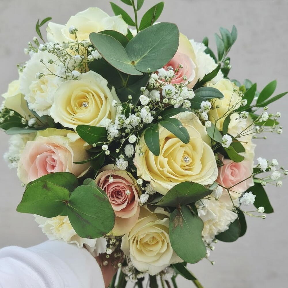 Этот красивый свадебный букет излучает элегантность и романтику, включая гармоничное сочетание нежно-розовых и бледно-желтых роз, символизирующих любовь и чистоту. Дополненный изящными веточками гипсофилы и пышными листьями эвкалипта, этот аранжировка выражает изысканность и грацию. Идеально подходит для свадьбы, букет добавляет нотку вечной красоты к образу любой невесты. Для оптимальной свежести обрежьте стебли перед тем, как поставить букет в воду, и убедитесь, что он находится в прохладном месте, подальше от прямых солнечных лучей. Ежедневно меняйте воду, чтобы цветы оставались яркими в течение вашего особенного дня.