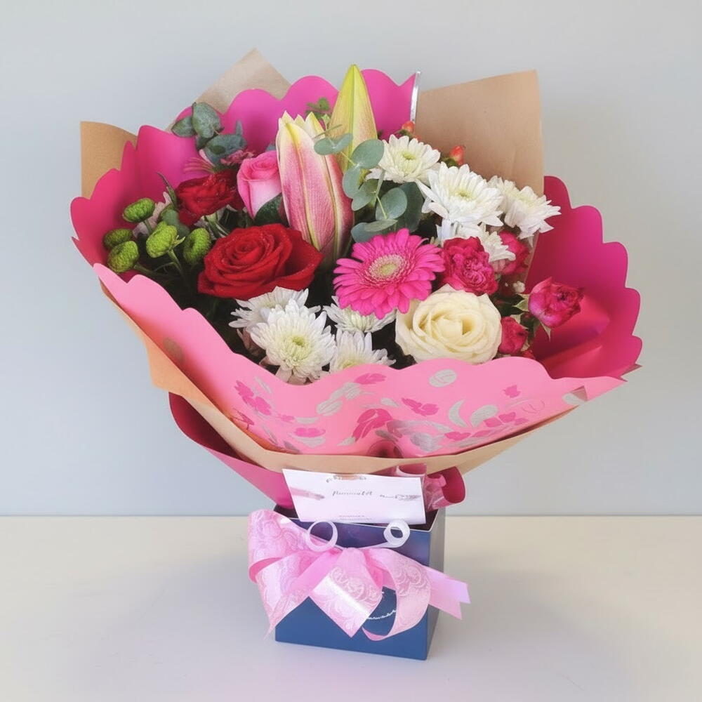 Этот очаровательный букет представляет собой яркую и элегантную композицию из свежесобранных цветов, созданную для того, чтобы приносить радость и тепло в любой повод. Сочетание роз, лилий, гербер и хризантем создает гармоничное сочетание ярких красных, нежных белых и живых розовых оттенков, дополненное богатой зеленой листвой для сбалансированного и свежего вида. Завернутый в стильную розовую бумагу с декоративным бантом, этот букет является идеальным подарком на дни рождения, годовщины или как трогательный сюрприз. Храните букет в прохладном месте, подальше от прямых солнечных лучей и сквозняков. Обрезайте стебли под углом каждые два дня и помещайте цветы в свежую, чистую воду. Опрыскивайте лепестки легко, чтобы поддерживать свежесть, и удаляйте любые увядшие цветы, чтобы продлить красоту букета.