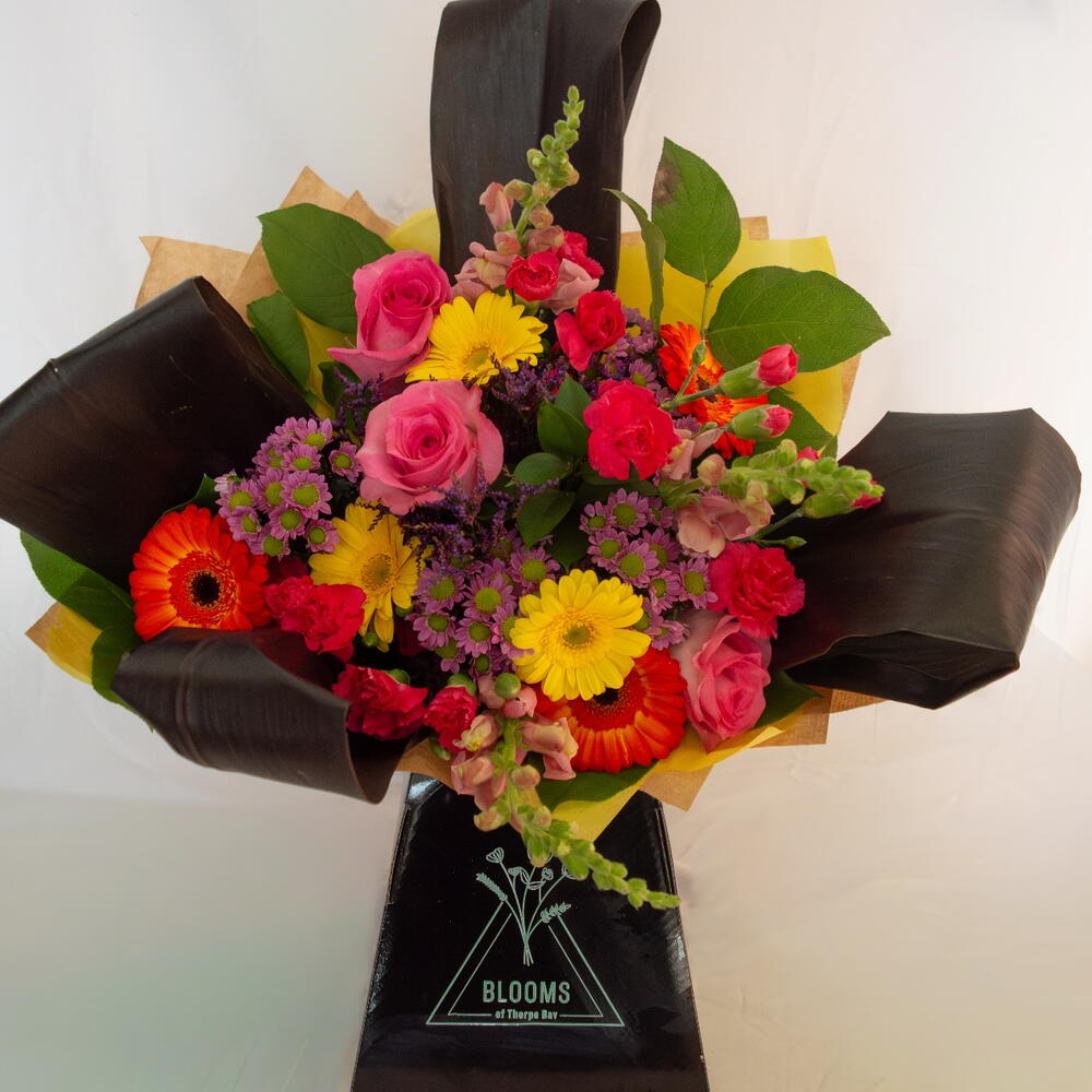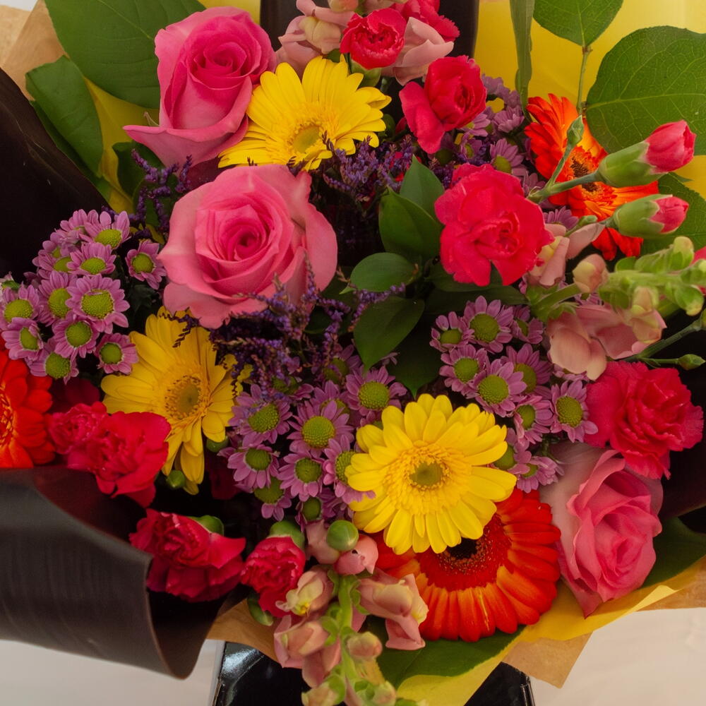 Живая и красочная смесь, этот букет сочетает оранжевые и жёлтые гермини с розовыми розами, львиным зевом, сиреневыми хризантемами сантини, вишнёвыми кустовыми гвоздиками и фиолетовым лимониумом. С акцентом на насыщенную тёмную листву, это смелая, радостная композиция, которая мгновенно добавляет яркости любому пространству.