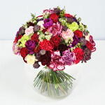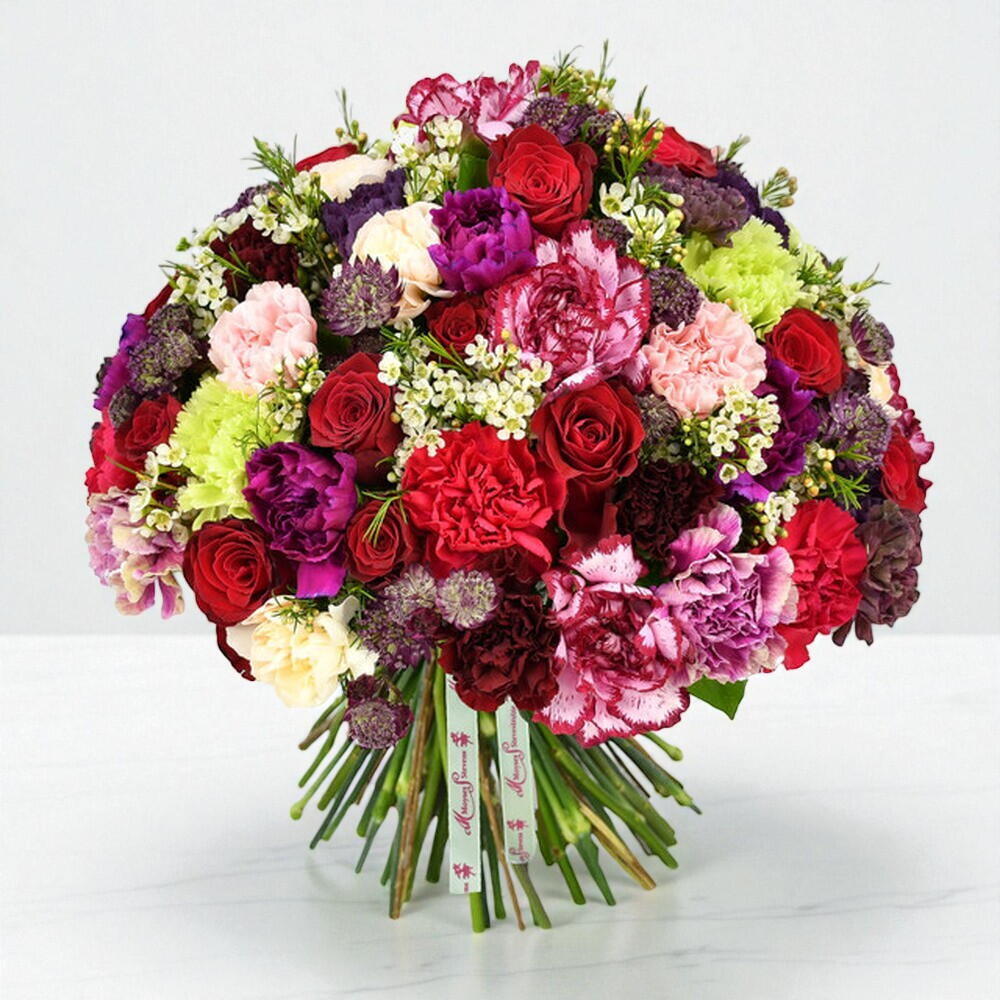 Эффектная смесь наших премиальных гвоздик в сочетании с красными розами, восковым цветком и астранцией.