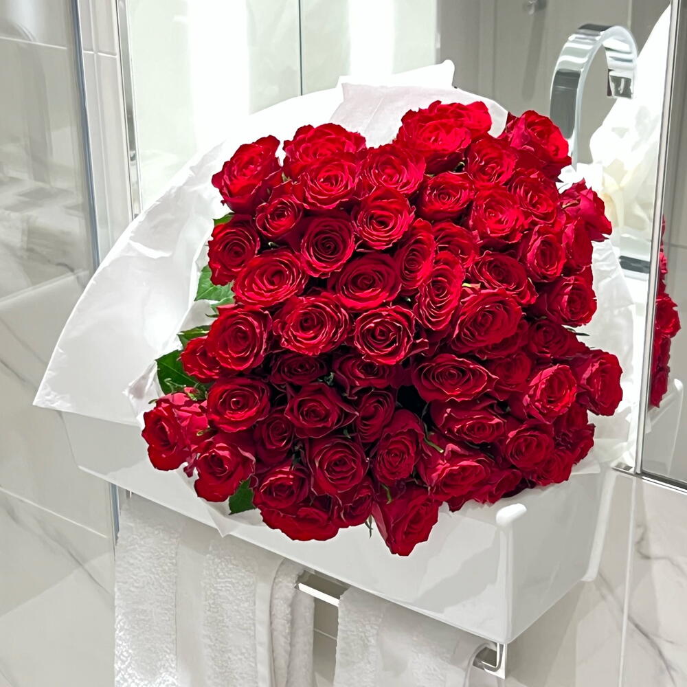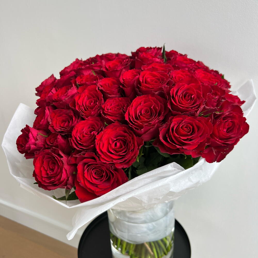 This bouquet of crimson roses embodies classic passion and eternal love. The vibrant, rich red hues symbolize deep emotions, while the simple, elegant wrapping adds a touch of refinement. Its the perfect choice for special occasions when you want to express sincere devotion or intense affection.