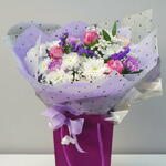 Этот потрясающий букет является прекрасным сочетанием элегантности и очарования. В его состав входят розы различных оттенков розового и пурпурного цвета, дополненные мягкой элегантностью белых хризантем. Нежное прикосновение гипсофилы добавляет ощущение легкости, в то время как веточки пурпурного статица приносят яркое цветовое пятно, завершая эту композицию свежим, воздушным ощущением. Букет обернут в мягкую лавандовую бумагу с черными акцентами, что делает его прекрасным подарком на любой случай. Чтобы ваш букет оставался свежим, обрежьте стебли под углом 45 градусов и поместите цветы в чистую воду. Не забывайте менять воду каждые несколько дней. Держите букет подальше от прямых солнечных лучей и источников тепла, чтобы цветы дольше оставались свежими.