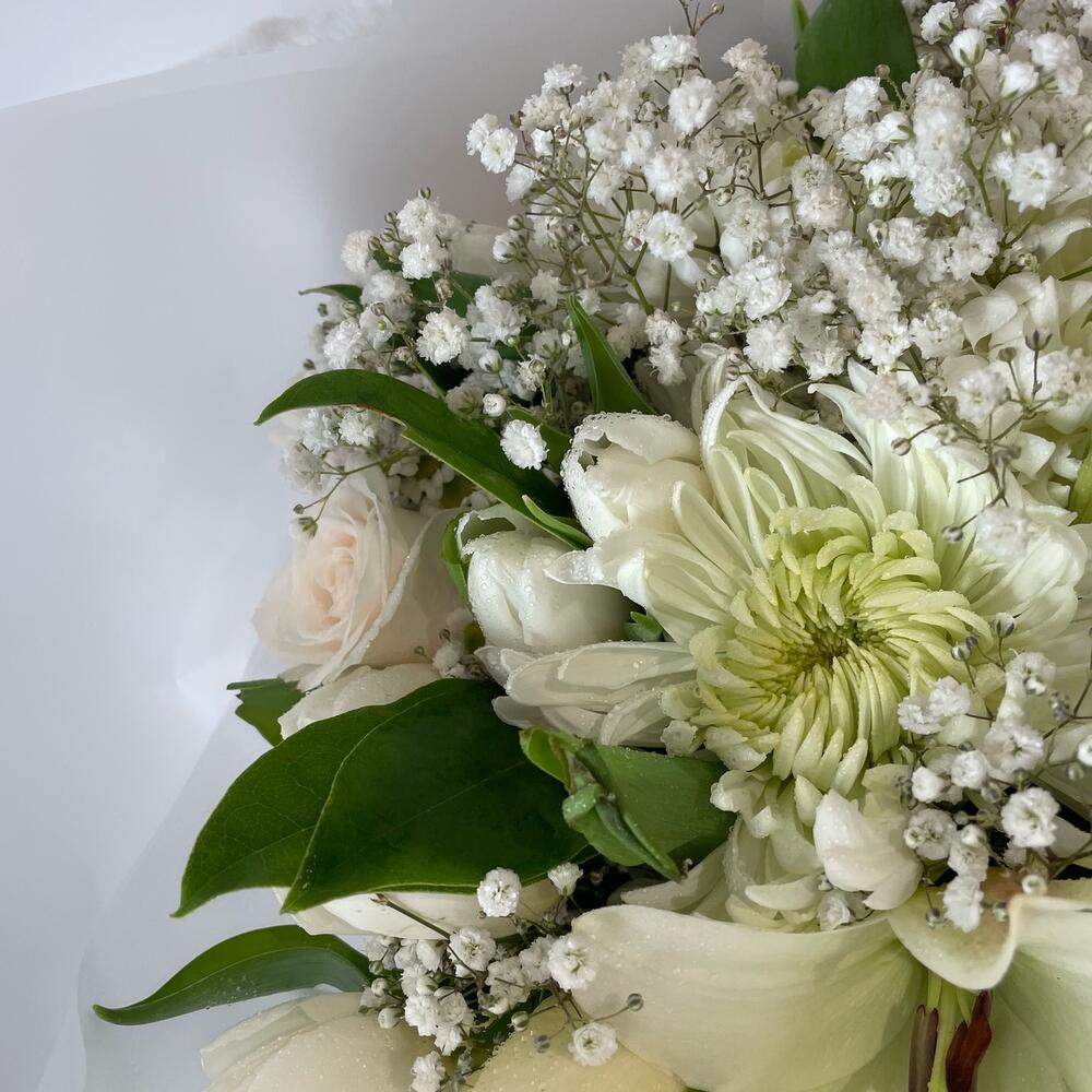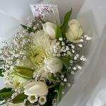 Белый, свежий и нежный букет соболезнований с лилиями, гипсофилой, розами, хризантемами и тюльпанами.
