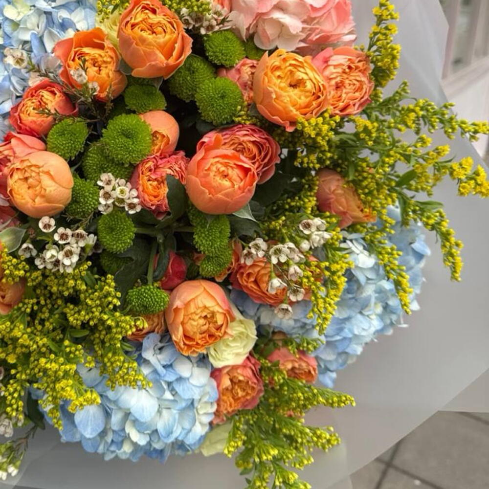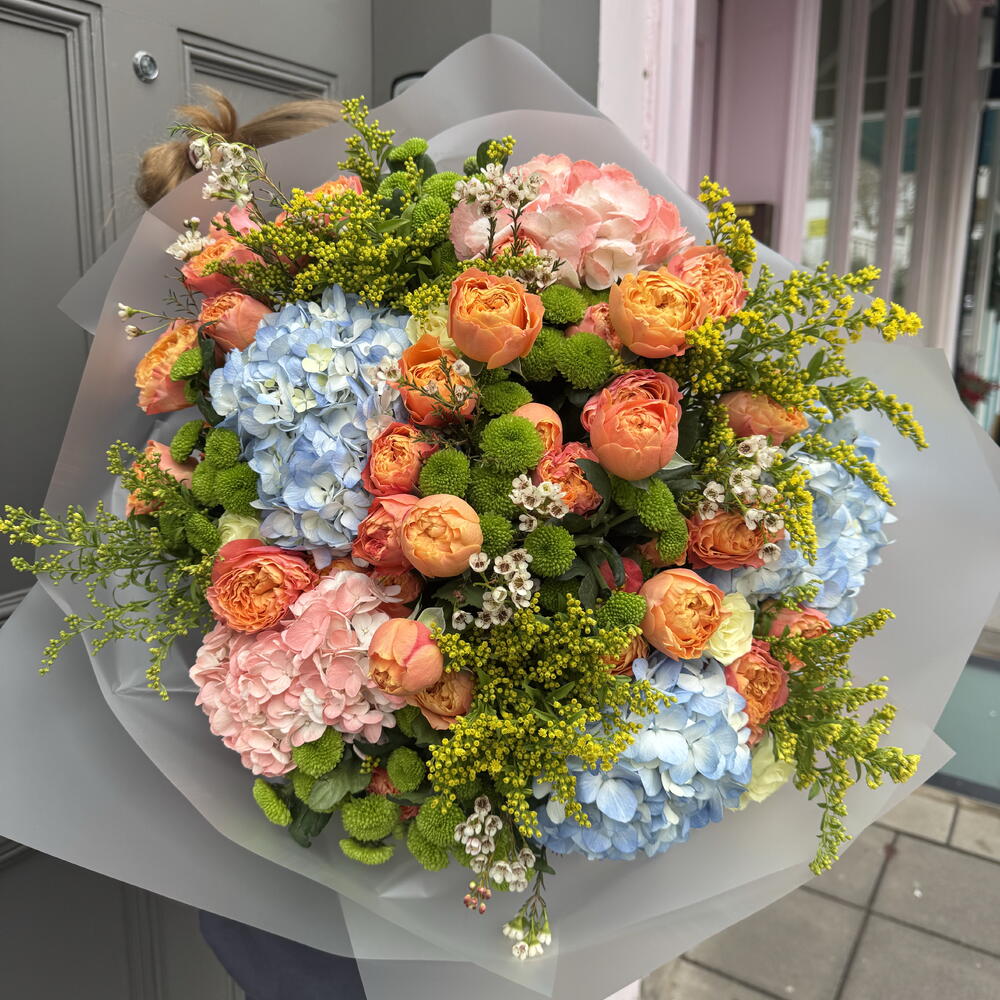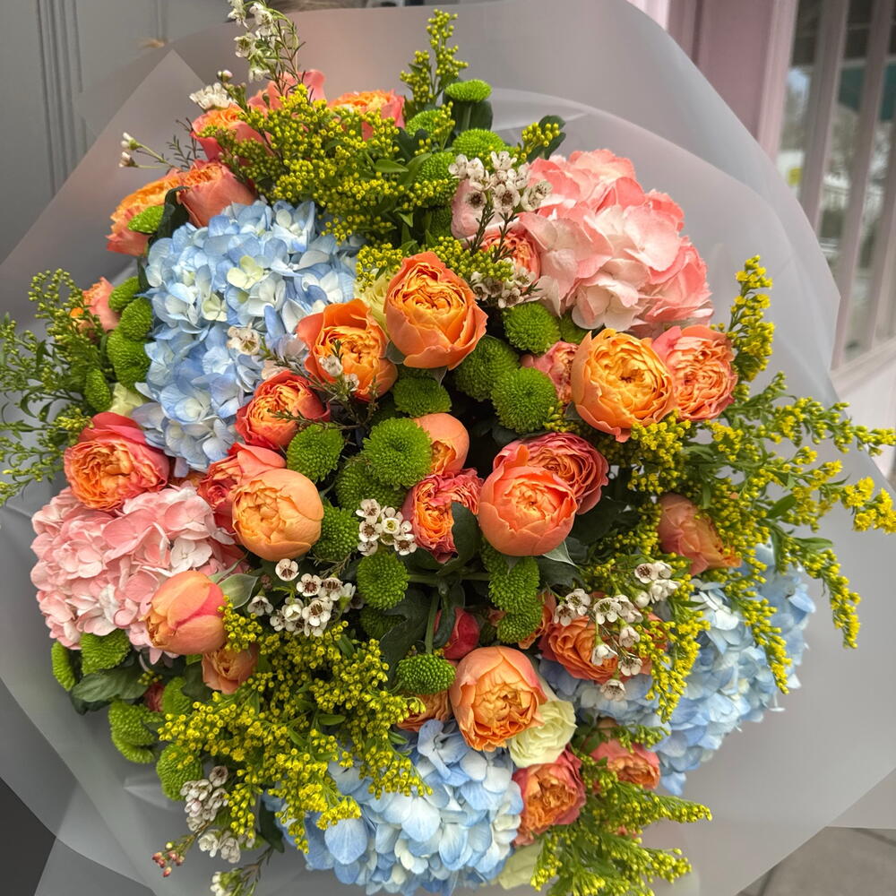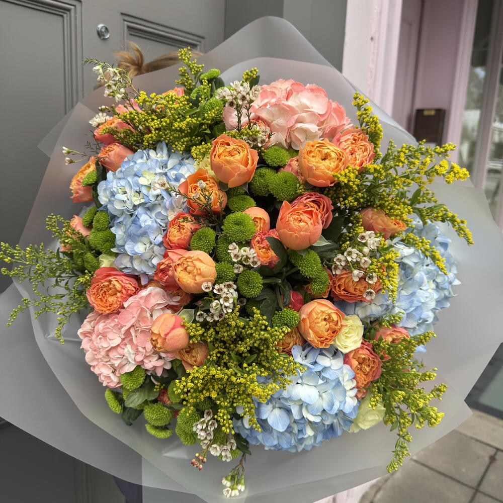 A vibrant and luxurious bouquet inspired by the colours of a glowing summer sunset. Lush coral spray roses are paired with soft pink and sky-blue hydrangeas, creating a captivating contrast of warmth and serenity. Accents of green chrysanthemums, delicate wax flowers and airy solidago add texture, freshness and a joyful burst of colour.