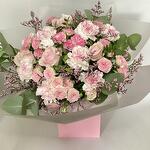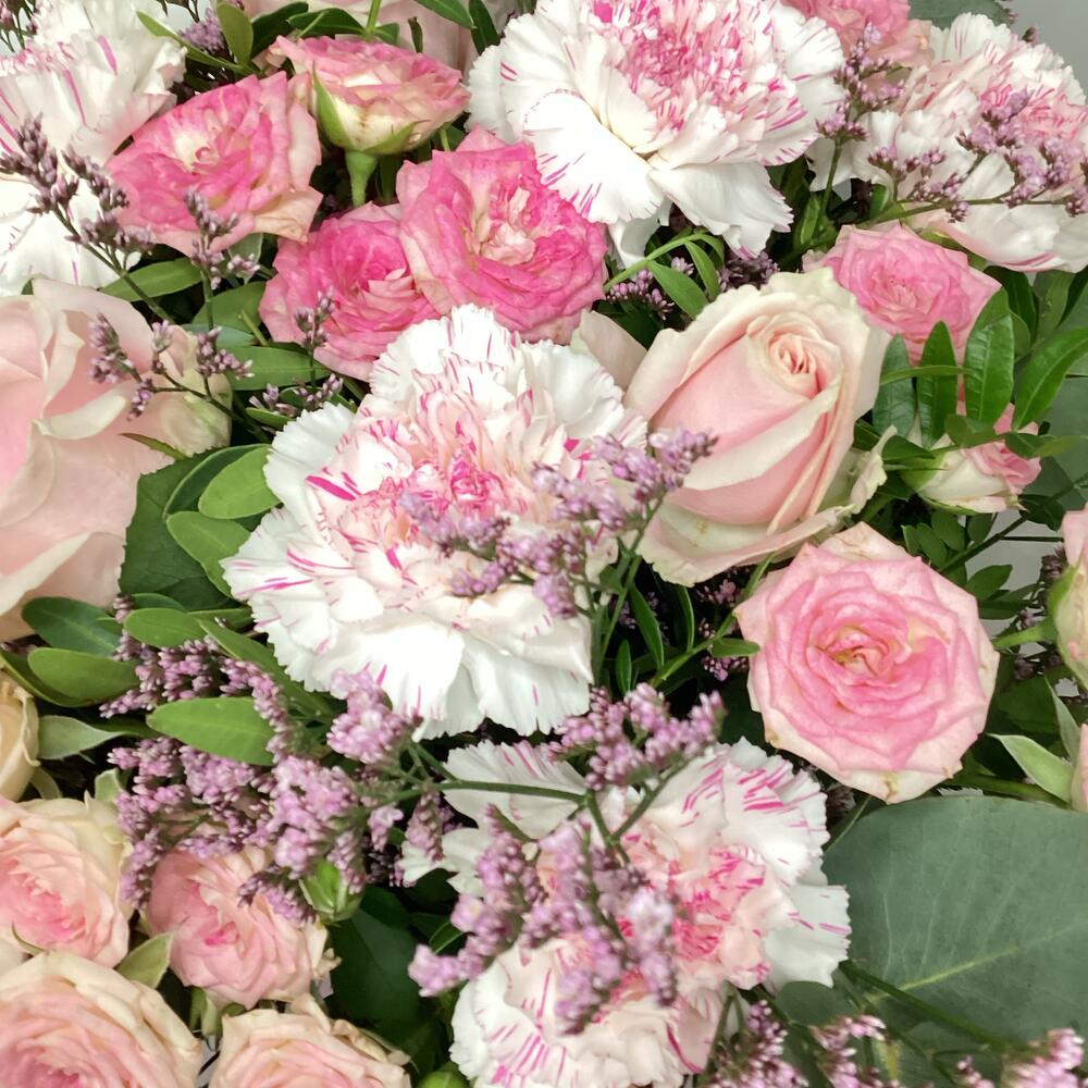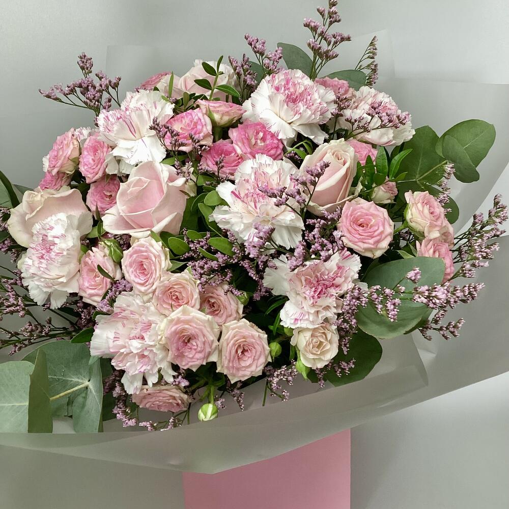 carnations - 9 шт. eucalyptus leaves - 5 шт. лимониум розовый - 3 шт. pink roses - 4 шт. розовые спрей-розы - 5 шт.