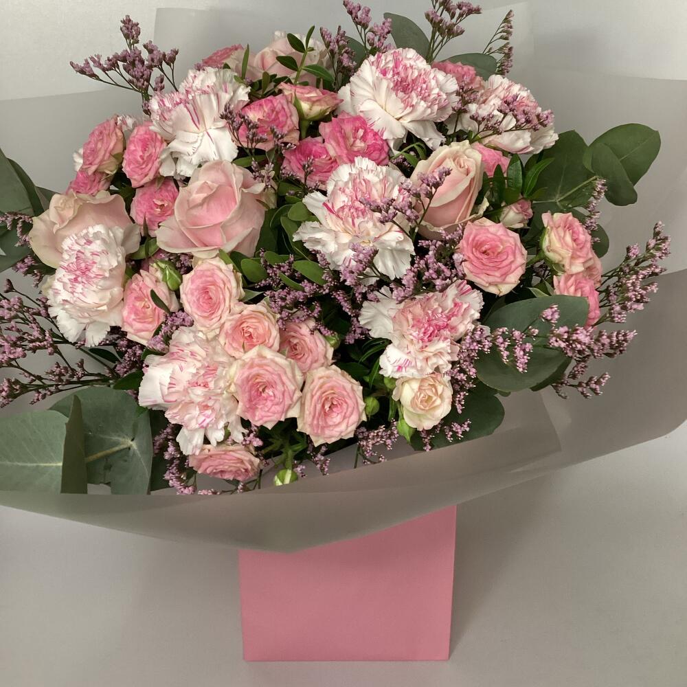 Красивый букет из цветов разных оттенков розового, включая розы, бутонные розы, лимониум и гвоздики с небольшим количеством зелени.
