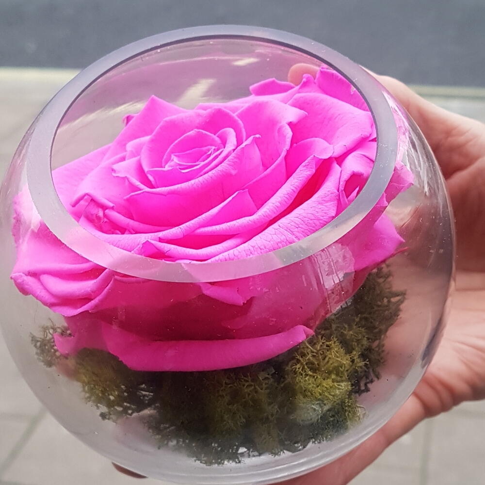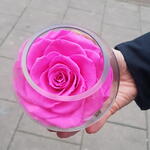 Настоящая розовая роза, сохраненная на срок до 3 лет и более, в прозрачной шарообразной вазе, уложенная на сохраненный мох и представленная в подарочной коробке с красивой тканевой бумагой, дополняющей розу. Подходит для любого случая: дни рождения, рождение девочки, годовщина, новый дом, я тебя люблю, просто так и т.д.
